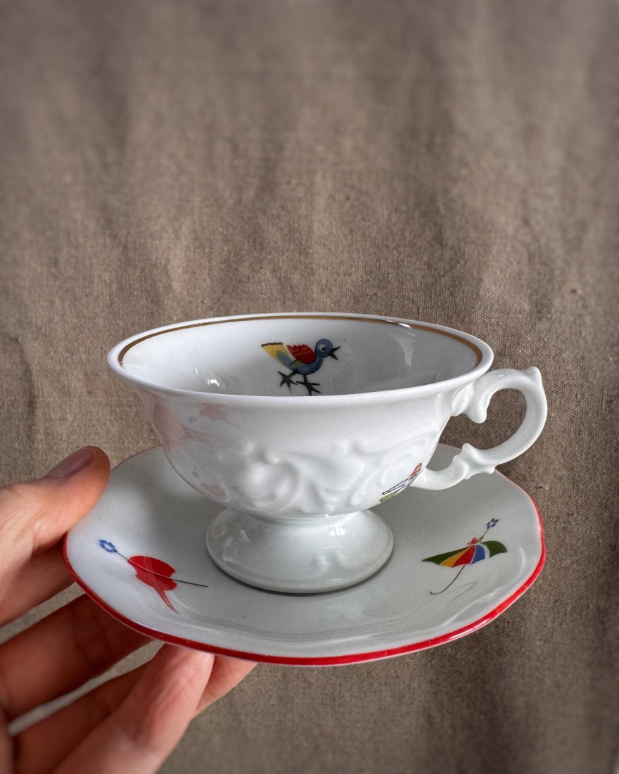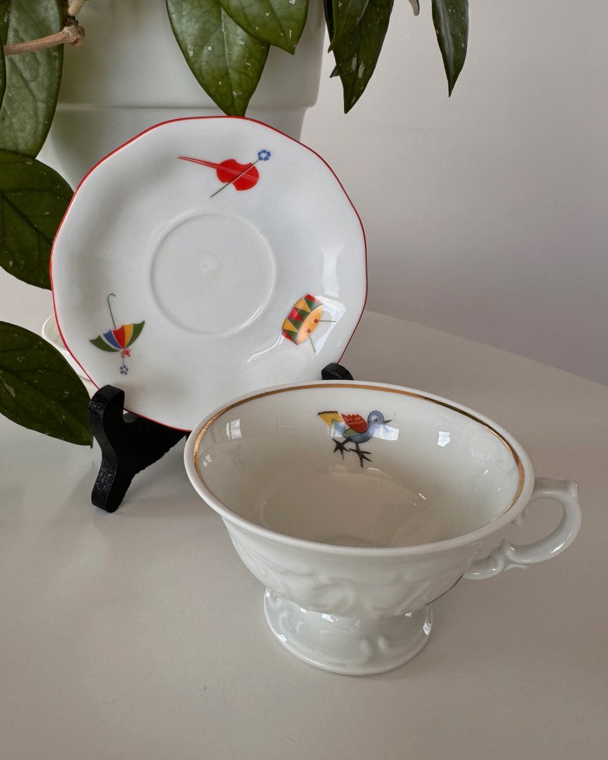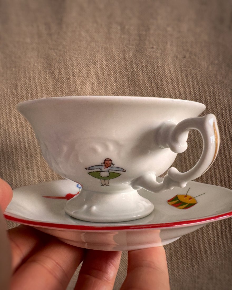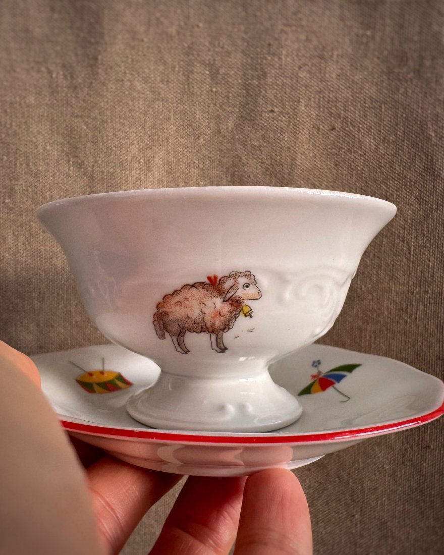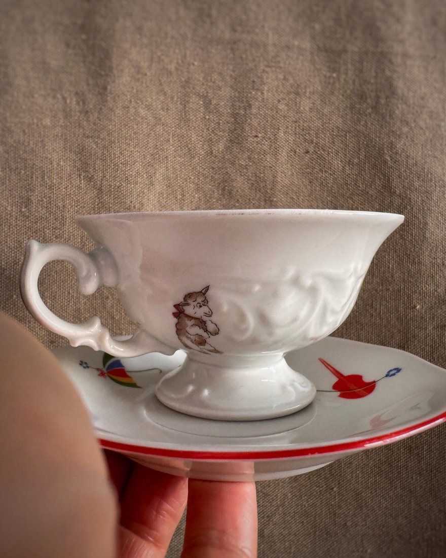 Do filiżanki dołączony jest spodek też z dziecięcymi motywami dekoracyjnymi.