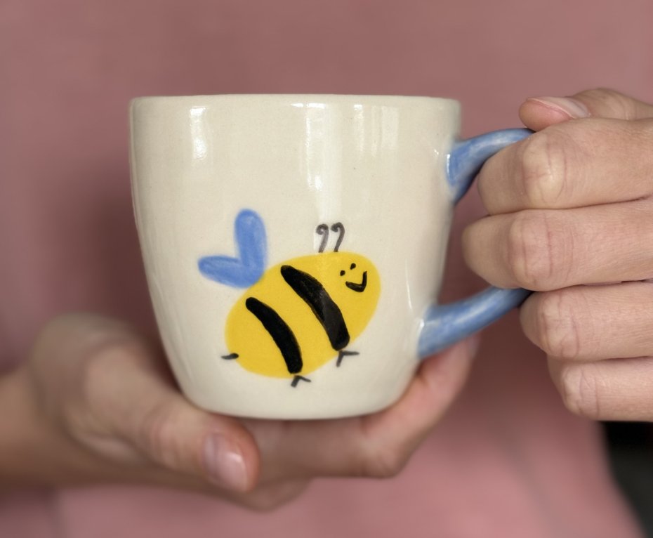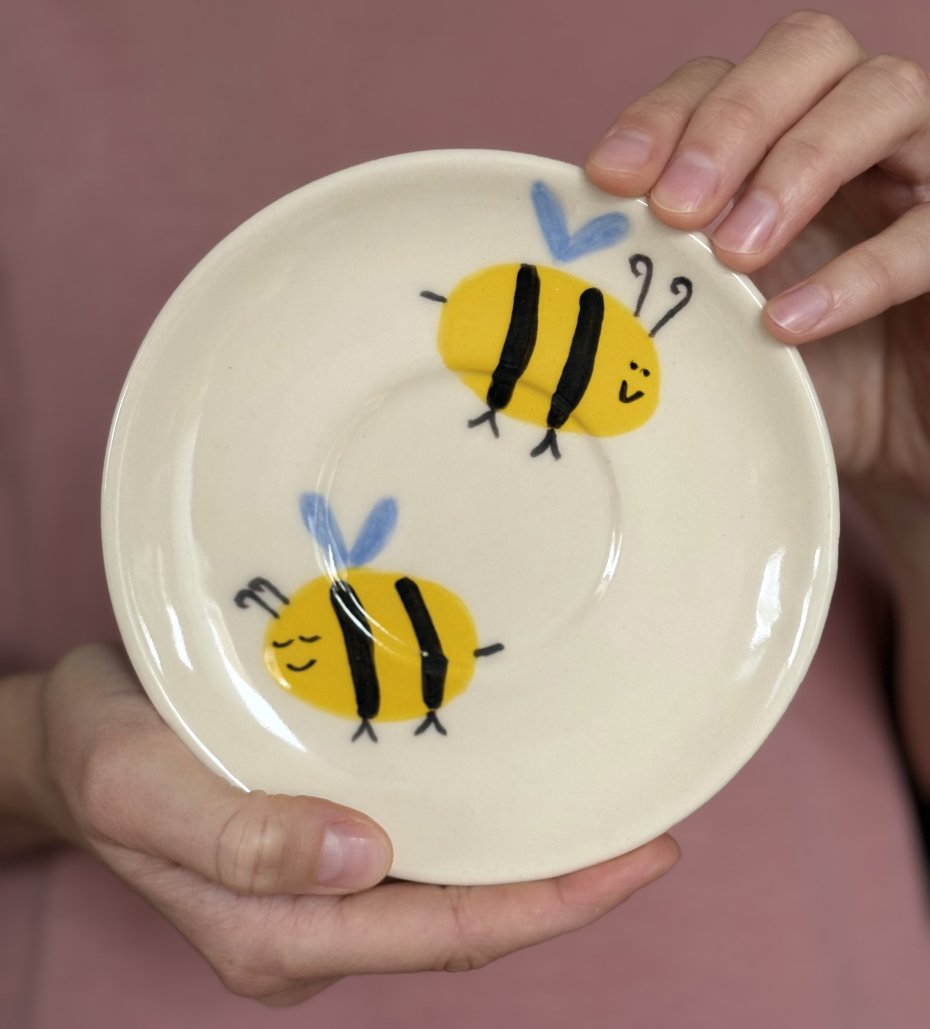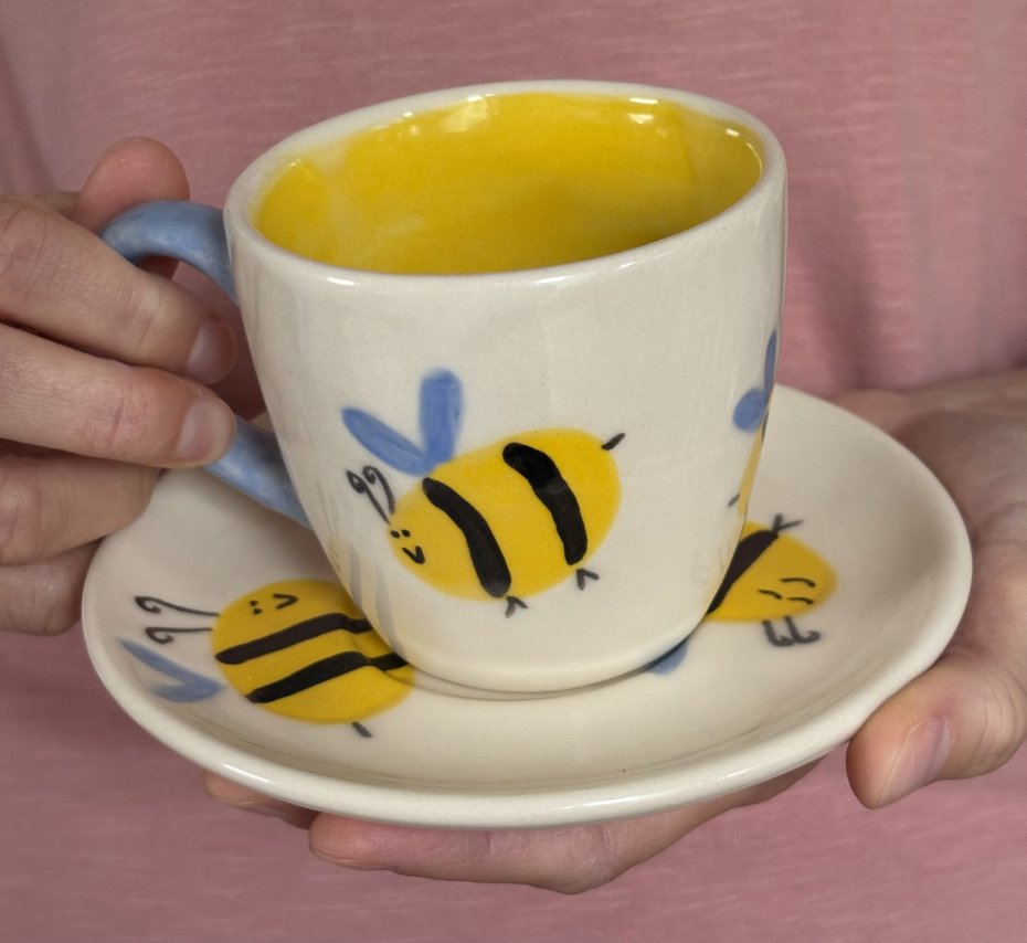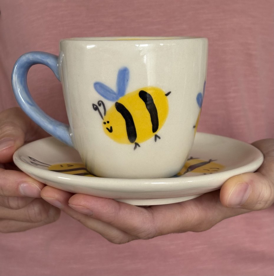 Filiżanka w wesołe pszczółki wraz z talerzykiem. Komplet został pomalowany i poszkliwiony ręcznie. Wypalony w piecu dwukrotnie, najpierw na biskwit, następnie na ostro. Użyte farby oraz szkliwo posiadają certyfikat do kontaktu z żywnością. Można myć w zmywarce. Pojemność filiżanki to 220 ml.