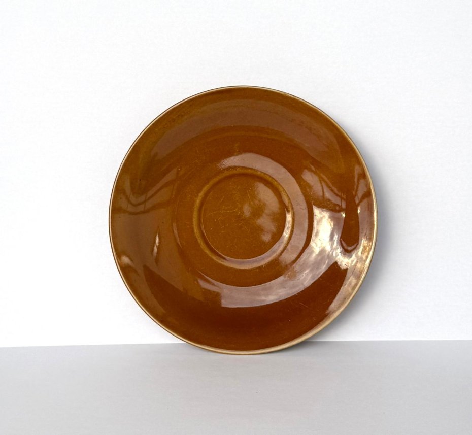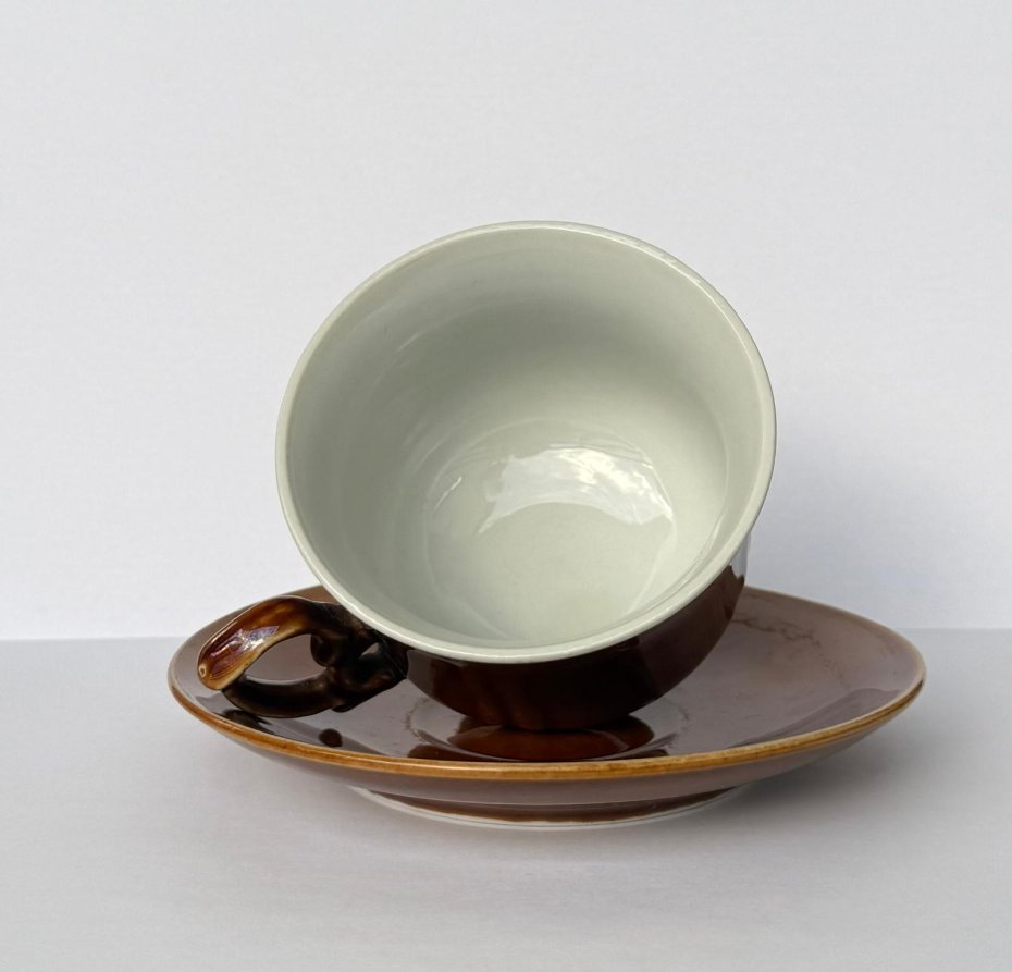 Filiżanka wyróżnia się charakterystycznym dla tamtego okresu designem – głębokim, brązowym kolorem o wysokim połysku oraz ozdobnym, profilowanym uszkiem. Korpus filiżanki posiada pionowe tłoczenia, które nadają jej klasycznego wyglądu.