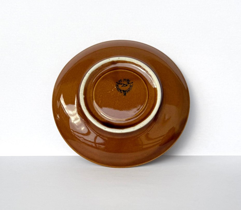 Filiżanka z podstawkiem wykonana z ceramiki szkliwionej. Przedmiot pochodzi z importu z Korei Północnej (D.P.R.K.) z lat 70-80 XX wieku. Gratka dla kolekcjonera i miłośników ceramiki PRL.