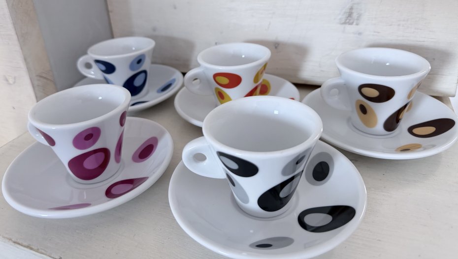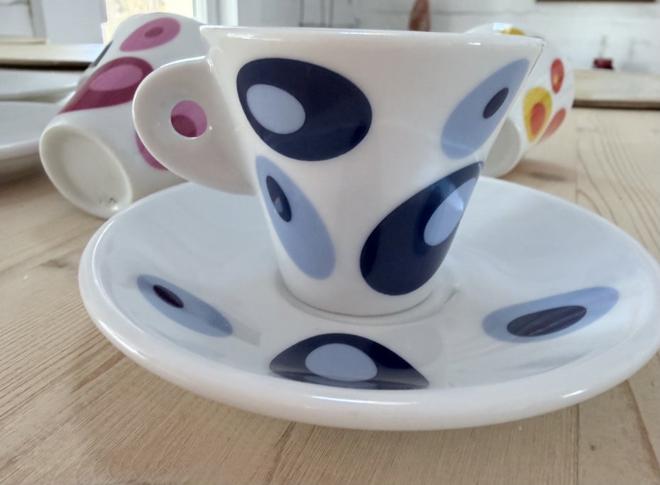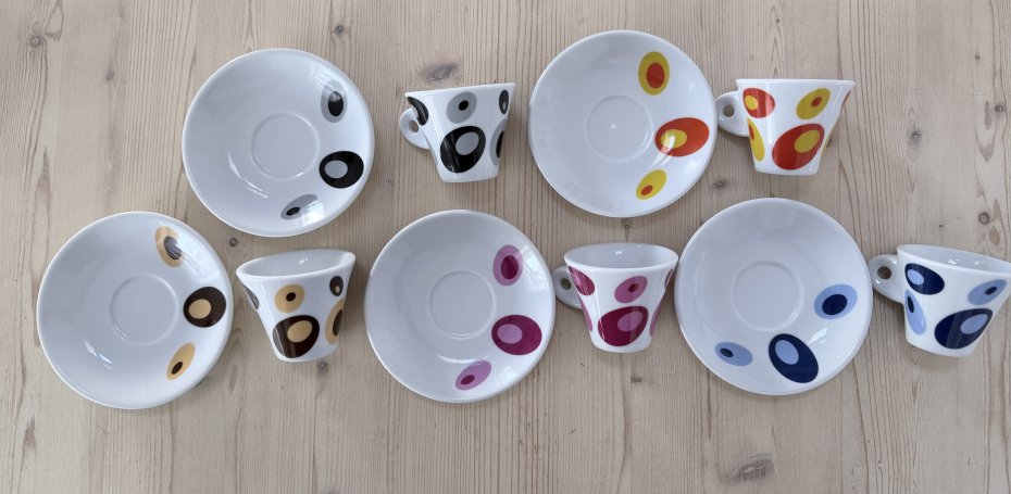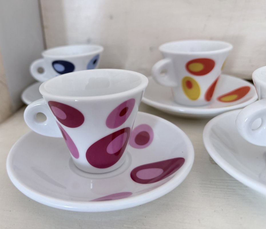 5 sztuk filiżanek z podstawkami kolorowe wzory na porcelanie- wzornictwo typowe dla lat 60 tych , wymiary spodeczek średnica 12 cm , filiżanka wys 6 cm podstawa średnica 3,5 cm , góra średnica 6,5 cm