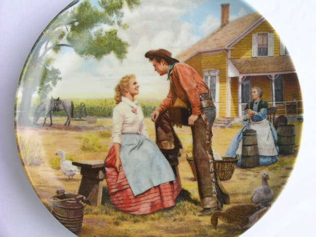 Kolekcjonerski talerz porcelanowy, sygnowany Knowles, amerykański. Z serii równie amerykańskiego filmu Oklahoma z 1955 roku. Notowany na międzynarodowej liście Bradex pod indywidualnym numerem 600 H. Edycja limitowana z 1985 roku. Satynująca, fotograficzna malatura. Z tyłu profesjonalny uchwyt do powieszenia. 21,5 x 3 cm. Stan zachowania bardzo dobry. Do kolekcji i na prezent :)