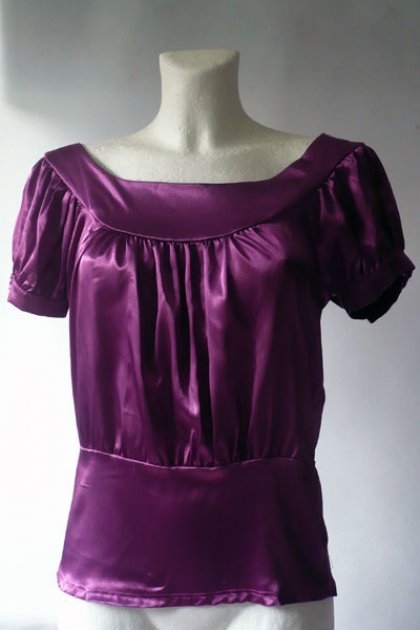 Bluzka firmy Terranova. Uszyta z błyszczącego atłasu. Marszczona do karczka. Na dole pas.Zamek z boku.Rękawki zapinane na mankiet.
