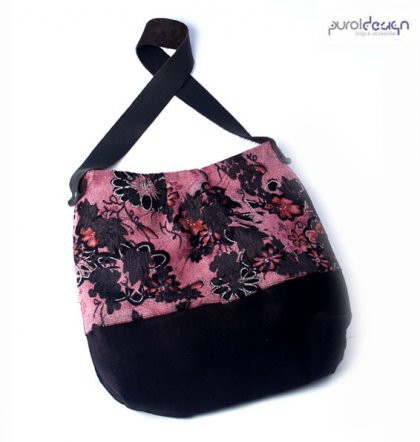 torebka wykonana ręcznie w pojedynczym egzemplarzu, wymiary: szer. 37cm, wys. 33cm, rączka 64 cm użyte materiały: fioletowy żakard z czarnymi kwiatowymi wzorami, czarny aksamit,czarna skórzana rączka, różowa podszewka z kieszonką, zapinan na magnes
