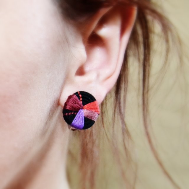 Delikatne klipsy wykonane zostały z czarnego rzemyka oraz kolorowych nitek. Średnica ok 1,8 cm. Możliwość zamówienia takich samych kolczyków, sztyftów.