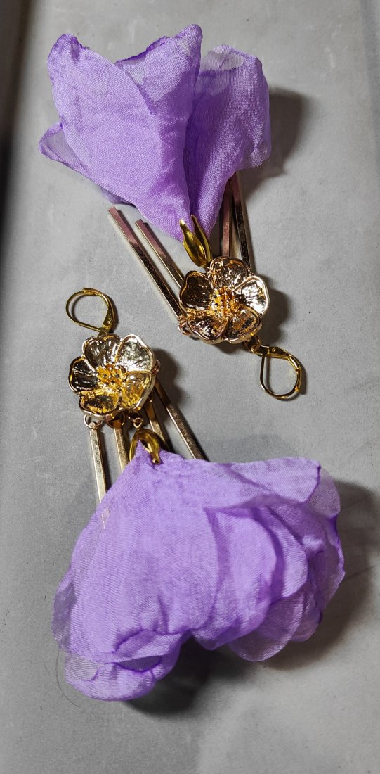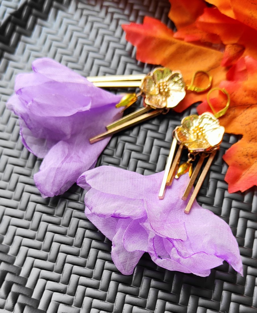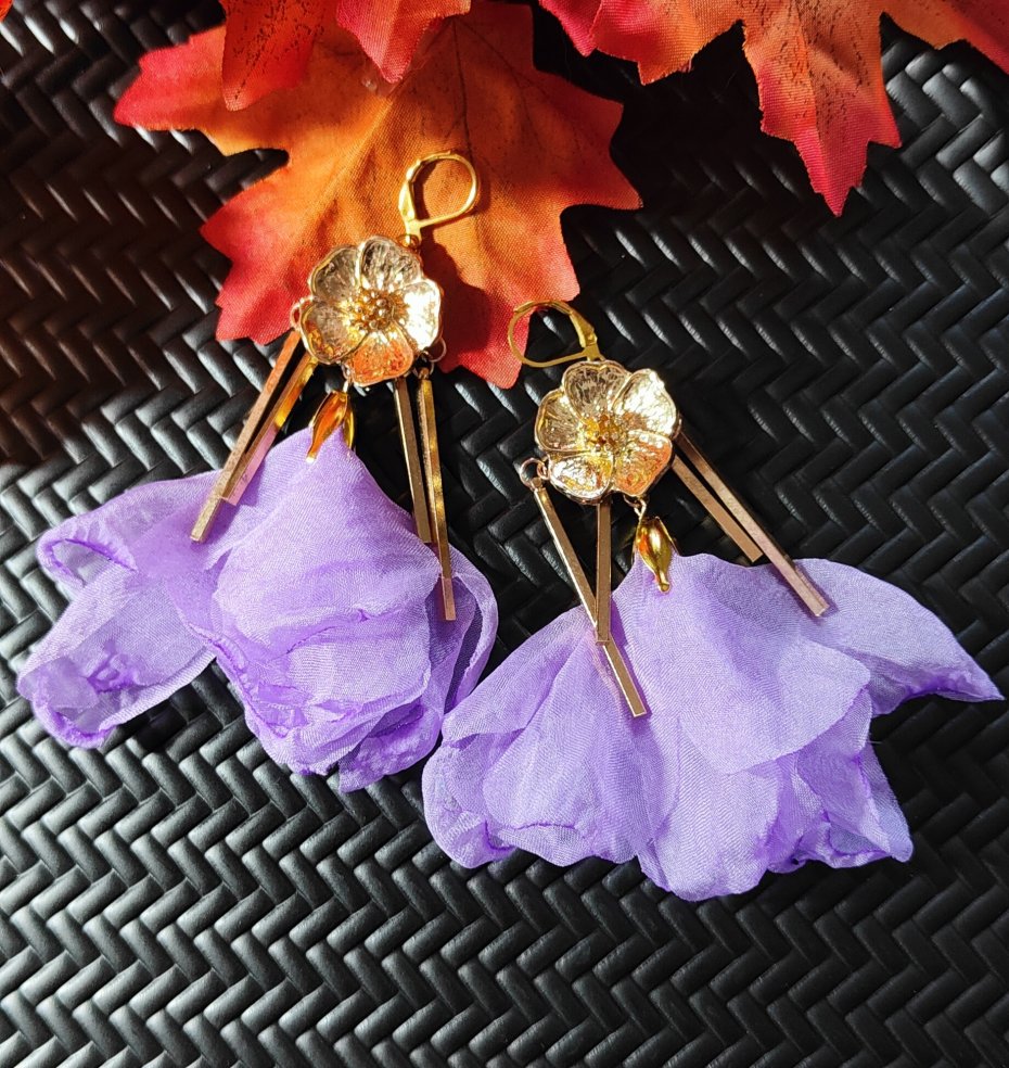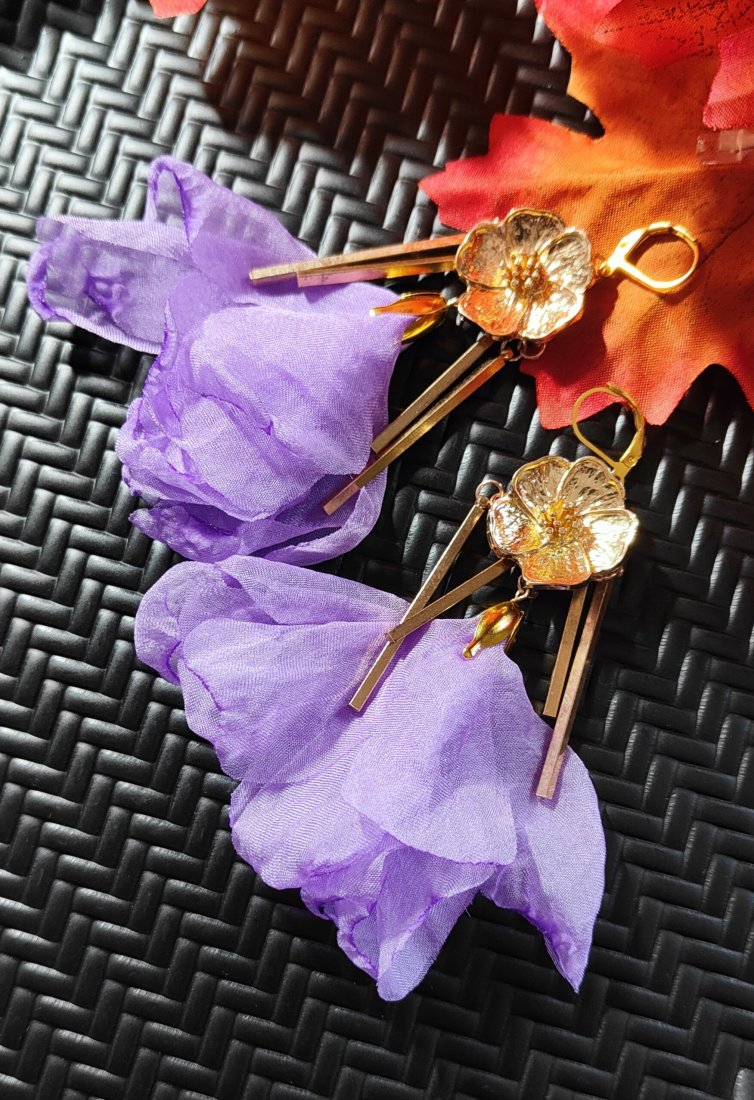 ,, fioletowa baletnica z kwiatem,, to oryginalne, zwiewne kolczyki utrzymane w kolorystyce fioletu i złota, wykonane z satynowego kwiatka i metalowych elementów wykończeniowych ze stali mosiądzu i metalu. Kolczyki zawieszone są na ozdobnych biglach typu angielskiego wykonanych ze stali szlachetnej.