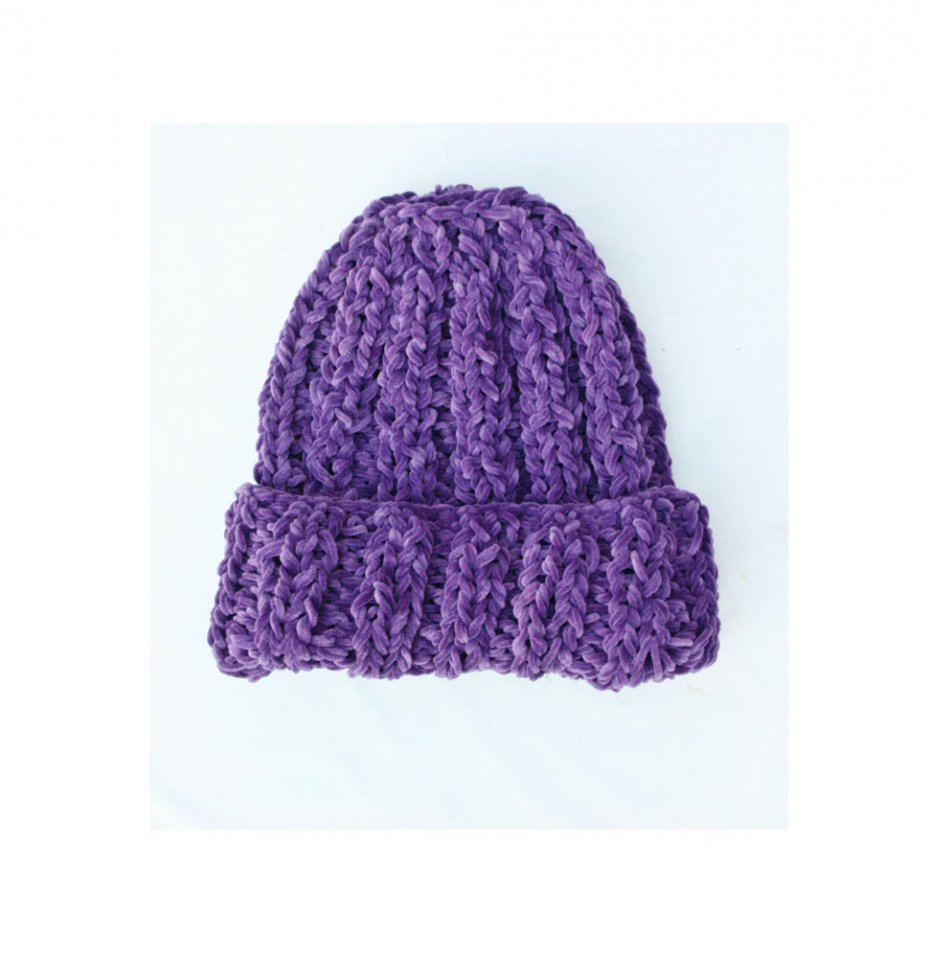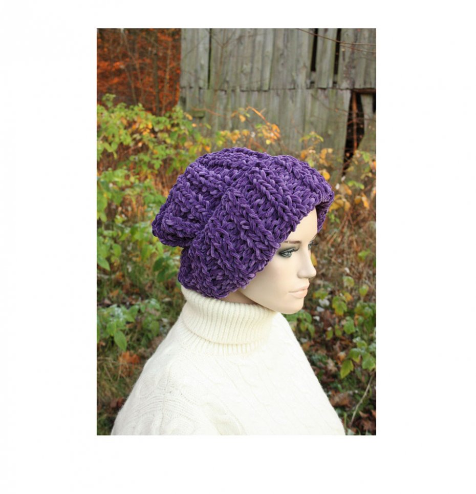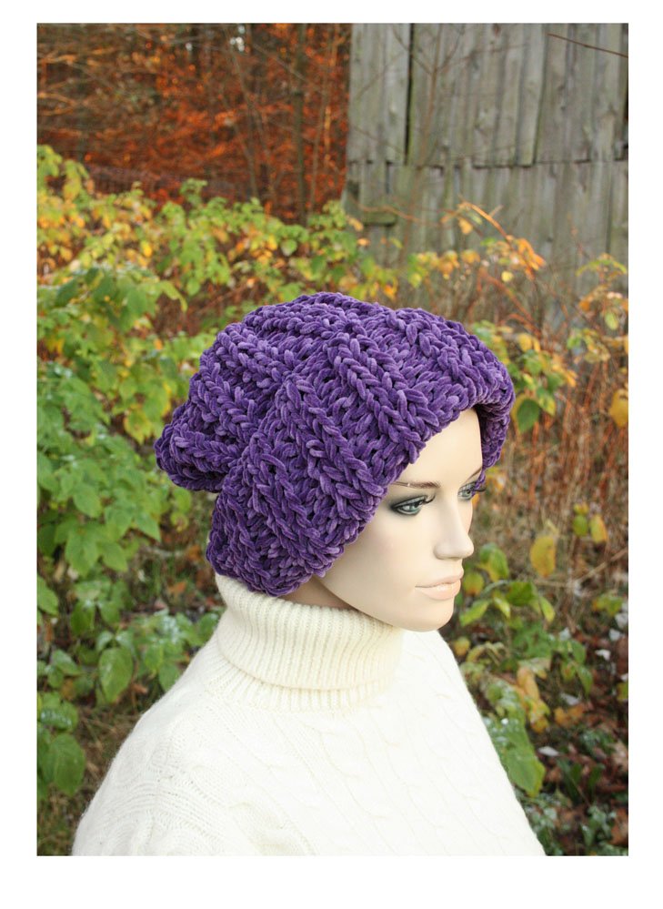 Ręcznie wykonana, duża, pojemna czapka w kolorze fioletowym.