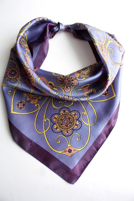 Fioletowa chusta w eleganckie wzory. Materiał to prawdopodobnie poliester.