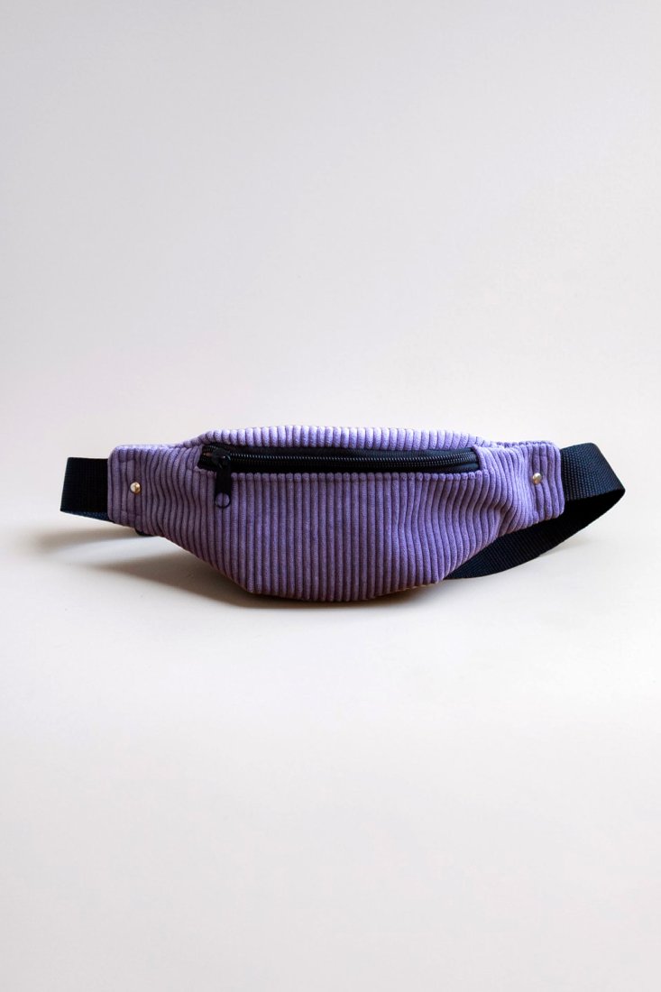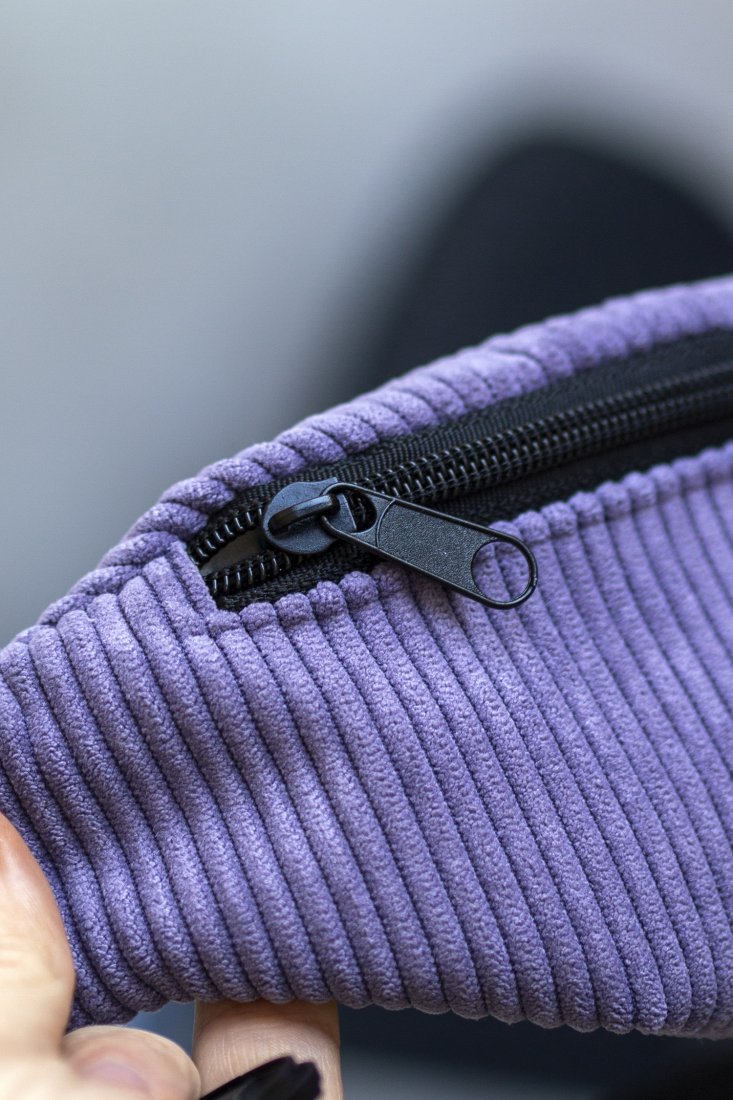 Mała saszetka, torebka biodrowa, nerka dla dziecka wykonana z cienkiego sztruksu w kolorze fioletowym. Zapinana na suwak.