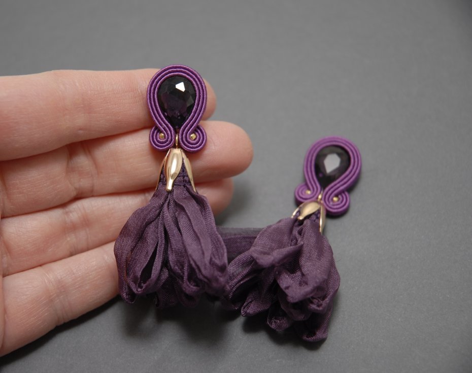 oferuję kolczyki zrobione techniką sutasz, ozdobione fasetowanym kaboszonem i kwiatkami z materiału