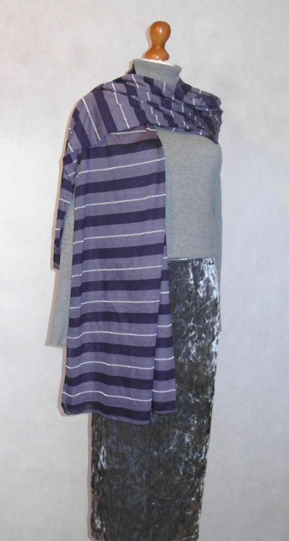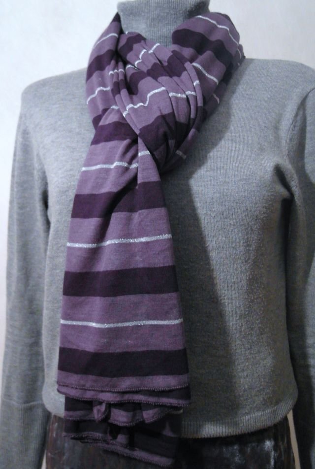 Duuuży szal z cienkiej dzianinki w pasy fioletowe i cieniutkie srebrne.Bardzo miły w dotyku,delikatnie elastyczny,cienki, rodzaj wiskozy (?)