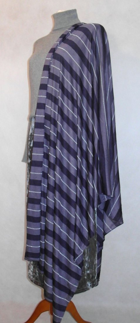 Duuuży szal z cienkiej dzianinki w pasy fioletowe i cieniutkie srebrne.Bardzo miły w dotyku,delikatnie elastyczny,cienki, rodzaj wiskozy (?)