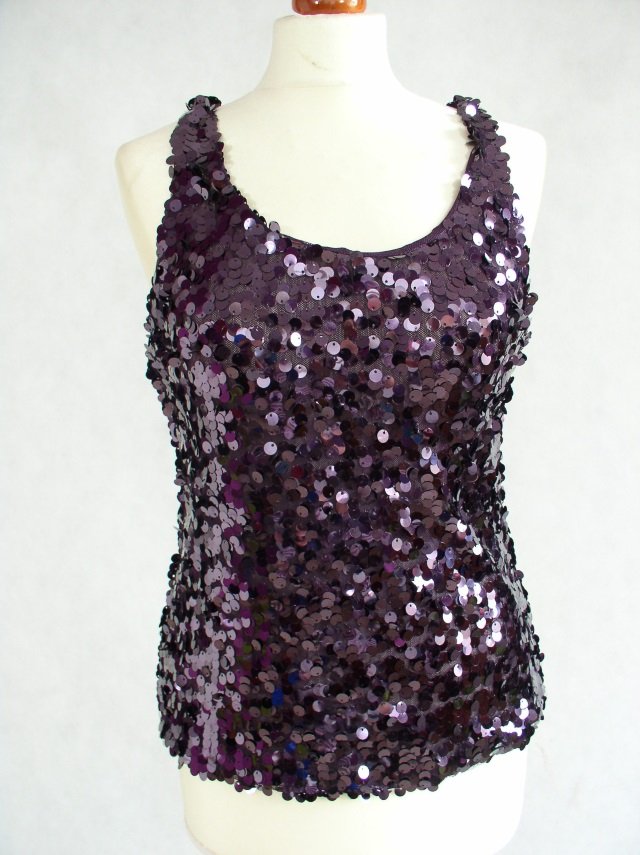 Wieczorowa,prosta bluzeczka.Spód elastyczna siateczka.Wierzch w naszyte fioletowe cekiny.Materiał polyester.Rozmiar XL.Stan bardzo dobry.Długość 60 cm.pod pachami 94 cm.
