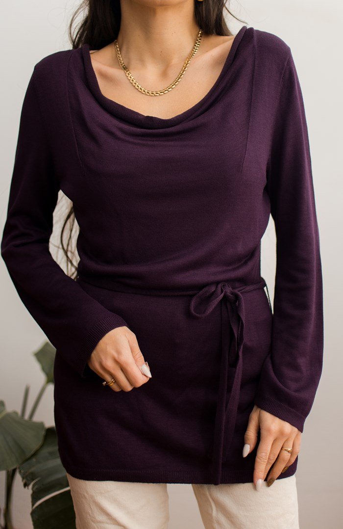 Cienki, fioletowy sweterek z paseczkiem.