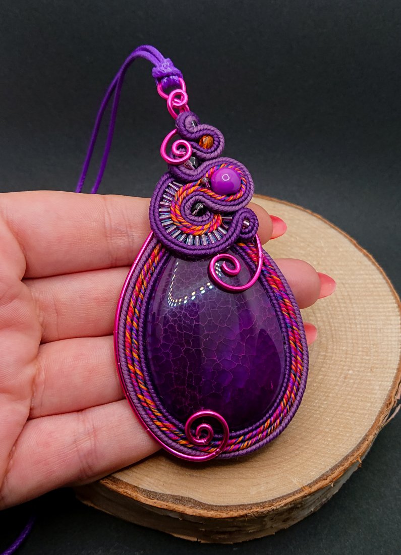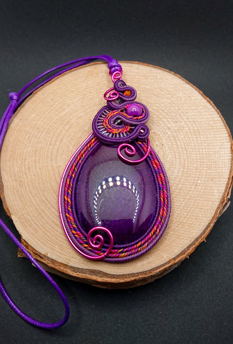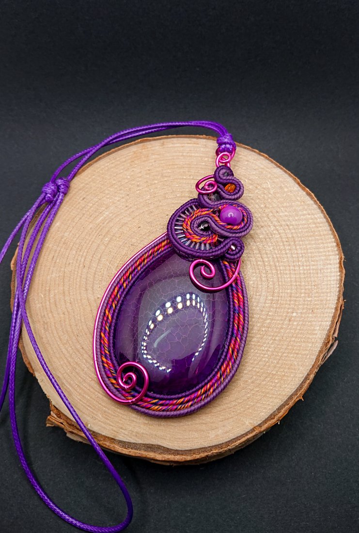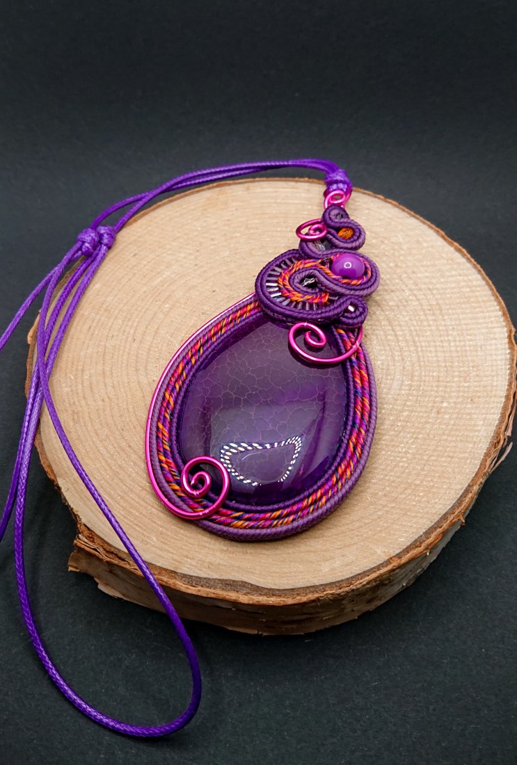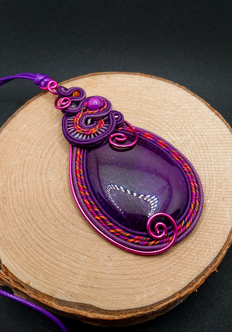 Fioletowy wisior sutasz z dużym ozdobnym agatem. Kamień otoczony sznurkami sutasz w odcieniach fioletu z dodatkiem koloru różowego i pomarańczowego. Góra wisiora ozdobiona elementem z szklanymi koralikami. Wisior został dodatkowo ozdobiony aluminiowym drutem w kolorze fuksji. Wisior zawieszony na długim fioletowym sznurku z możliwością regulacji długości.