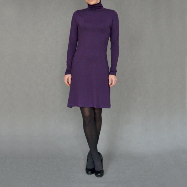 Fioletowa elastyczna sukienka. Z golfem zapinanym z tyłu na guziczki tworząc łezkę. Krój lekko rozszerzający się.