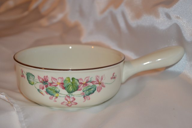 Uroczy porcelanowy rondelek , zdobiony fiołkami , sygnowany ROYAL CHINA.