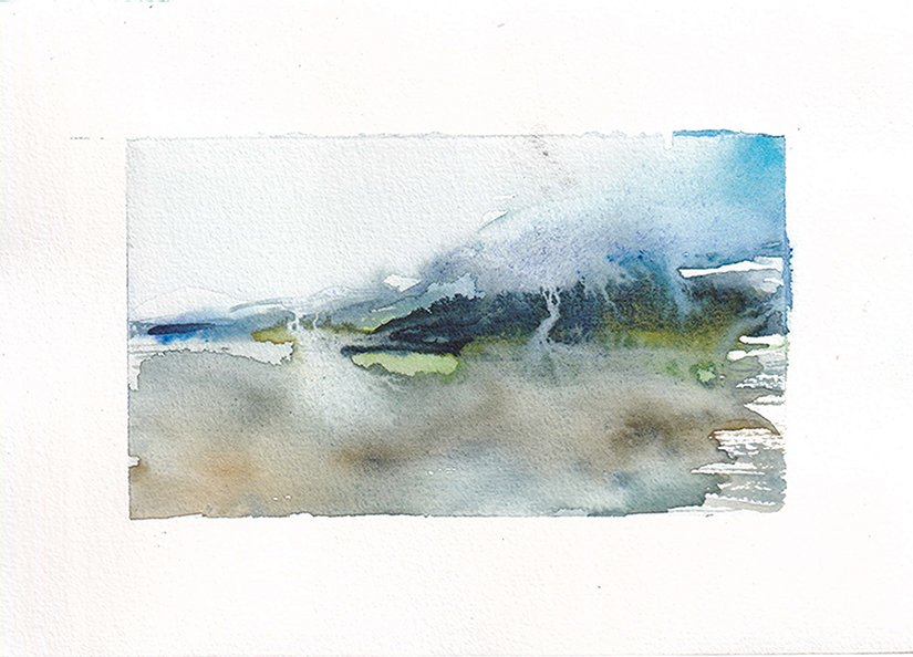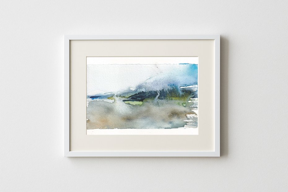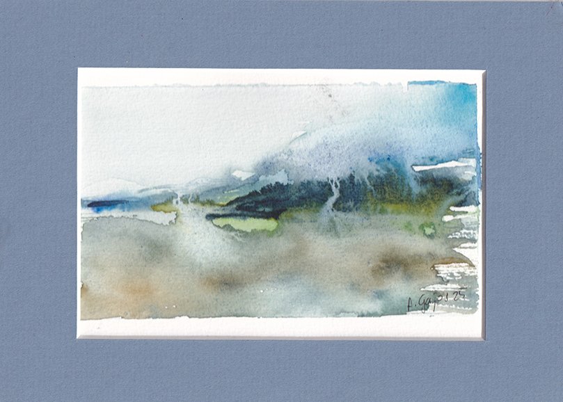 Delikatna, nastrojowa akwarela inspirowana krajobrazem fiordów. Subtelne przejścia barw – od chłodnych błękitów po miękkie zielenie i szarości – budują wrażenie przestrzeni i mgły unoszącej się nad wodą. Artysta posługuje się lekką, niemal impresyjną plamą barwną, wydobywając z prostoty form poetycką atmosferę północnego pejzażu.