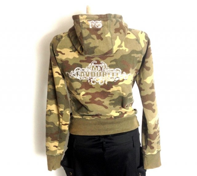 Bawełniana ciepła bluza moro z kapturem marki Fishbone , zasuwana na suwak, kieszenie kangurki, przy kapturze ściągana, z przodu u dołu jak i z tyłu zdobiona napisami.Dół bluzy jak i rękawy wykończone ściągaczem.