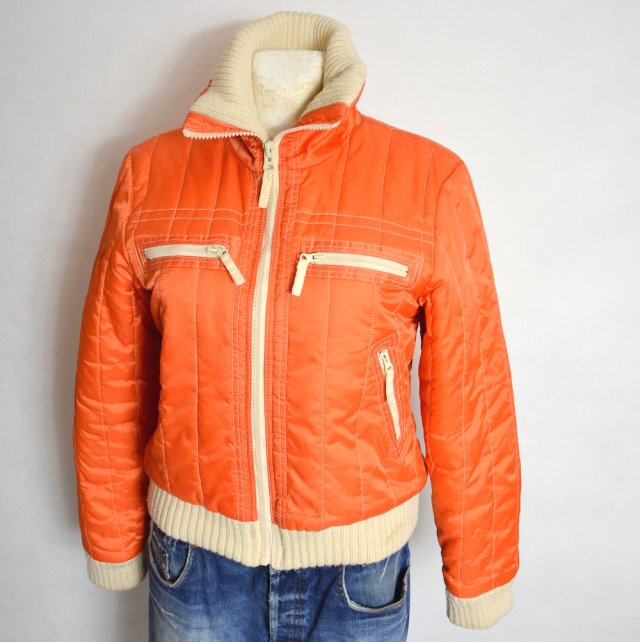 Oryginalna ,oldskulowa kurtka marki Fishbone w świetnym pomarańczowym kolorze, z kontrastowymi białymi ściągaczami i białymi suwakami , kurtka zasuwana pod samą szyję a nawet wyżej.Z przodu 2 pary kieszeni- u dołu i u góry.Posiada podszewkę, kurtka ocieplana jak sądzę watą. Kurtka w świetnym pomarańczowym kolorze- łagodnym, nie nachalnym.
