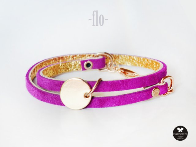 Minimalistyczna bransoletka z kolekcji FLO, wykonana z wysokiej jakości skóry włoskiej, naturalnej zamszowej w odcieniu energetycznej fuksji.. Elementy metalowe w kolorze złotym. Zapinana na metalowy karabińczyk w kolorze złotym. Elementy metalowe wysokiej jakości - nie ciemnieją. Wewnątrz wykończona złotą skórą naturalną. Do dwukrotnego owinięcia wokół nadgarstka. Obwód regulowany ok 17-18 cm Lekka i wygodna. Ładnie układa się na nadgarstku. W zależności od ustawień monitora, kolory w rzeczywistości, mogą nieznacznie różnić się od przedstawionych na zdjęciu. © wzór chroniony prawem autorskim Opatrzona metką projektanta.