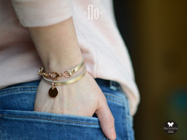 Minimalistyczna bransoletka z kolekcji FLO, wykonana z wysokiej jakości skóry naturalnej metalizowanej o odcieniu szampańskiego złota. Elementy metalowe w kolorze złotym. Zapinana na metalowy karabińczyk w kolorze złotym. Obwód regulowany 15 -16 cm Elementy metalowe wysokiej jakości - nie ciemnieją. Wewnątrz wykończona złotą skórą naturalną. Do dwukrotnego owinięcia wokół nadgarstka. Lekka i wygodna. Ładnie układa się na nadgarstku. W zależności od ustawień monitora, kolory w rzeczywistości, mogą nieznacznie różnić się od przedstawionych na zdjęciu. © wzór chroniony prawem autorskim Opatrzona metką projektanta.