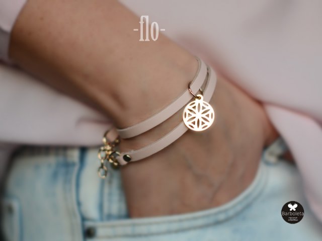 Minimalistyczna bransoletka z kolekcji FLO, wykonana z wysokiej jakości skóry naturalnej włoskiej. Odcień jasnego różu. Elementy metalowe w kolorze złotym. Zapinana na metalowy karabińczyk w kolorze złotym. Elementy metalowe wysokiej jakości - nie ciemnieją. Wewnątrz wykończona złotą skórą naturalną. Do dwukrotnego owinięcia wokół nadgarstka. Obwód regulowany około 15-17 cm.