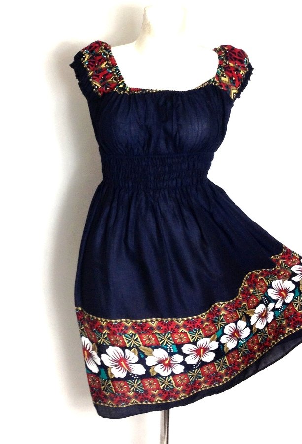 Prześliczna sukienka o fasonie rozkloszowanym wykonana z viscozy, kolor granatowy w piękne wzory kwiatowe , pod biustem marszczona guma.