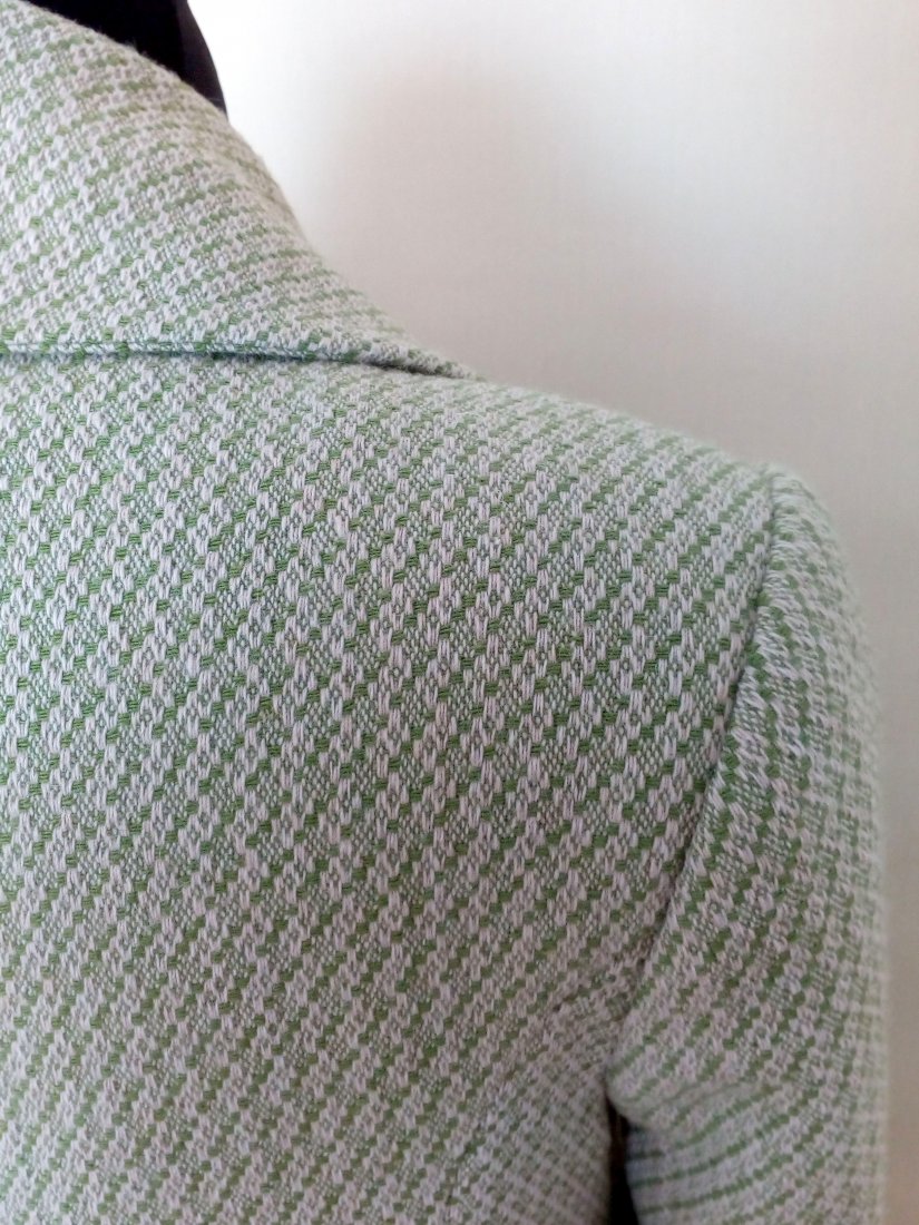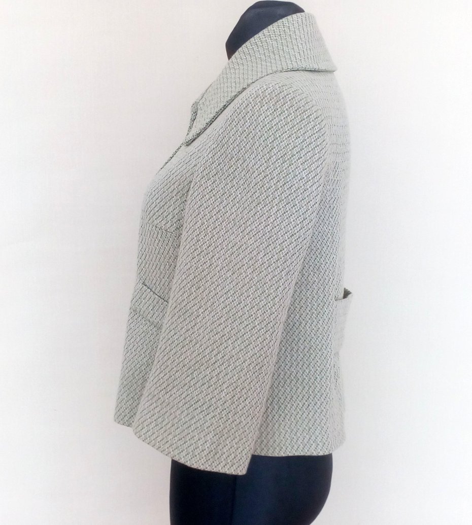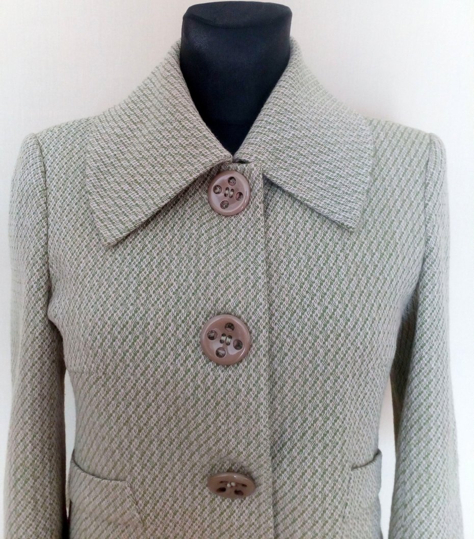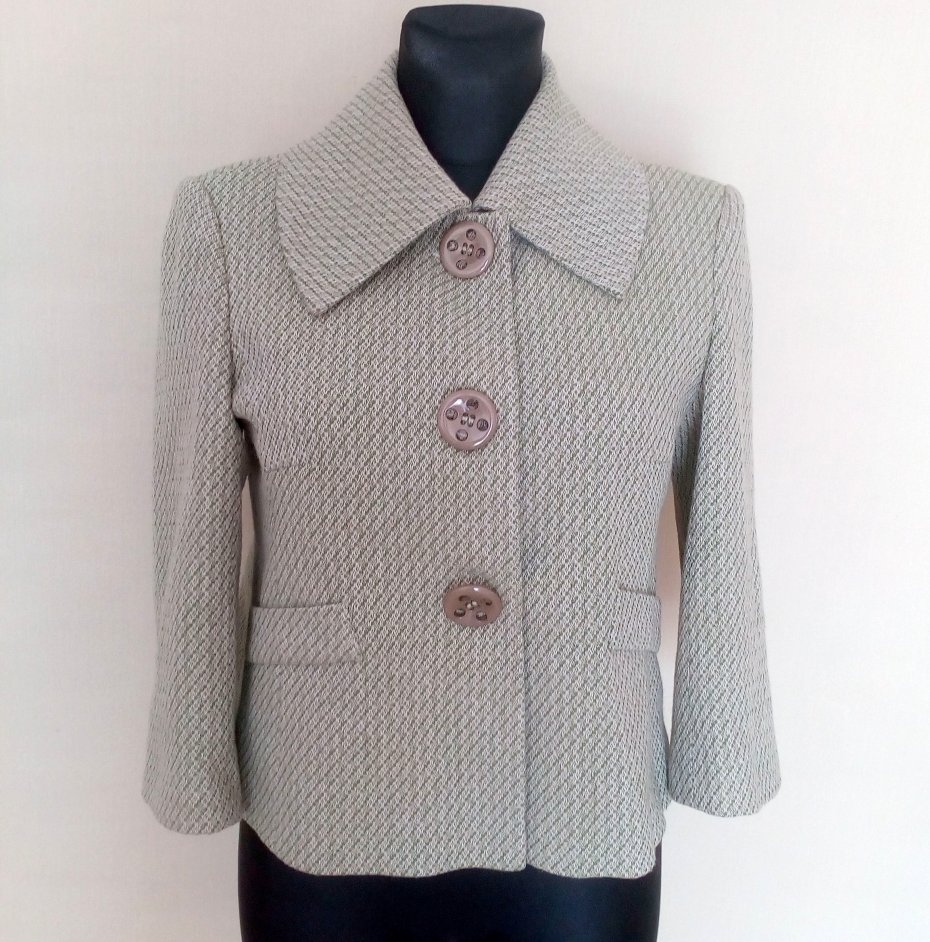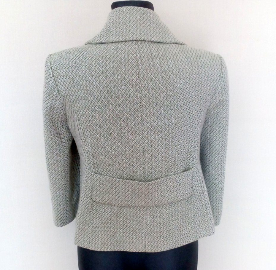 Elegancki, krótki żakiet, zapinany na trzy duże guziki, z przodu patki imitujące kieszenie, rękaw o długości 3/4, na ramionach cienkie poduszki, w tyle szeroka patka, tkanina z drobną fakturą w kolorze zielono-beżowym, od środka jasnozielona podszewka