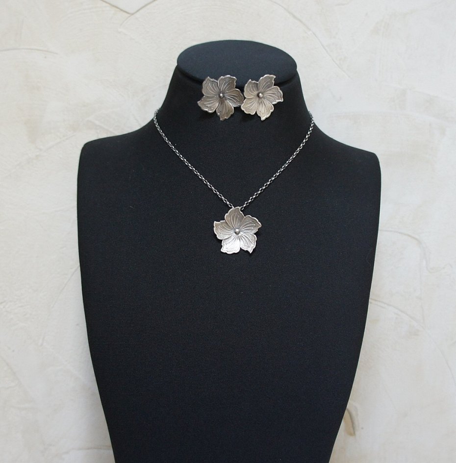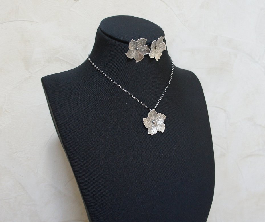 Naszyjnik wykonany ze srebra [pr. 925] w połączeniu z dużym srebrnym kwiatem. Wielkość kwiatka [30mm]. Srebro oksydowane i przecierane. Całkowita długość naszyjnika 50cm. Biżuteria ozdobnie zapakowana. Do kompletu można dopasować kolczyki -dostępne w naszej galerii.