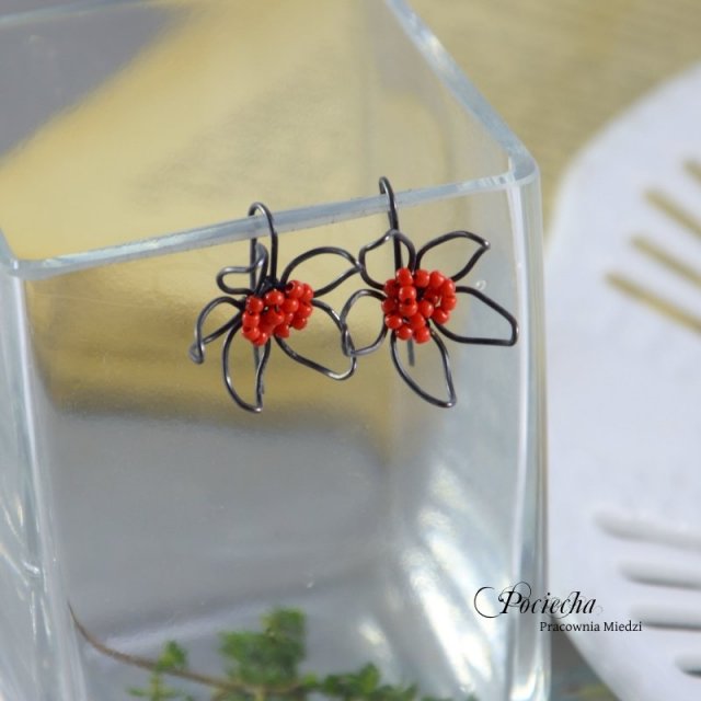 Urocze kolczyki w formie kwiatków. Wykonane od podstaw ręcznie z miedzi. Centrum każdego kwiatka stanowią szklane koraliki. Kolczyki patynowane na czarny kolor i polerowane.