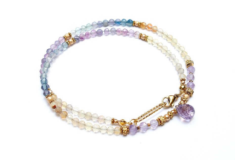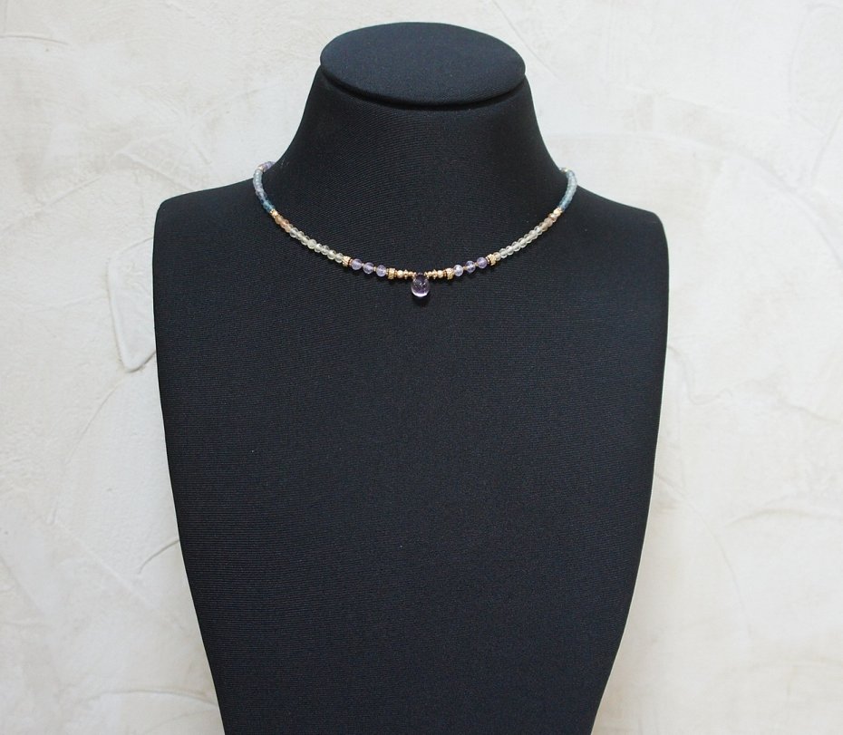 Krótki, delikatny naszyjnik wykonany w całości z pozłacanej stali szlachetnej oraz naturalnych kamieni - fasetowanego fluorytu [4mm], fasetowanego, platerowanego hematytu o matowej powierzchni [2mm i 3 mm], przekładek z hematytu [1mm] oraz fasetowanej brioletki ametrynu. Naszyjnik o długości ok. 44,5cm.