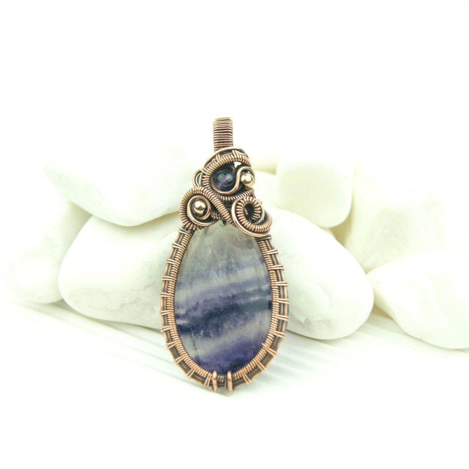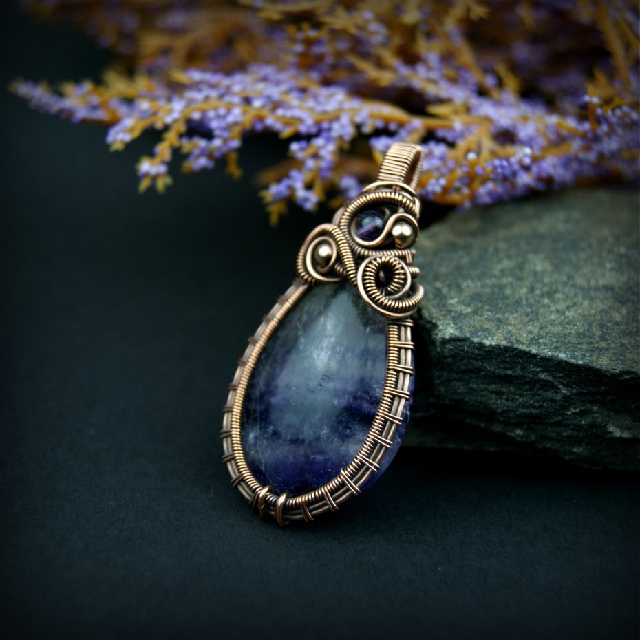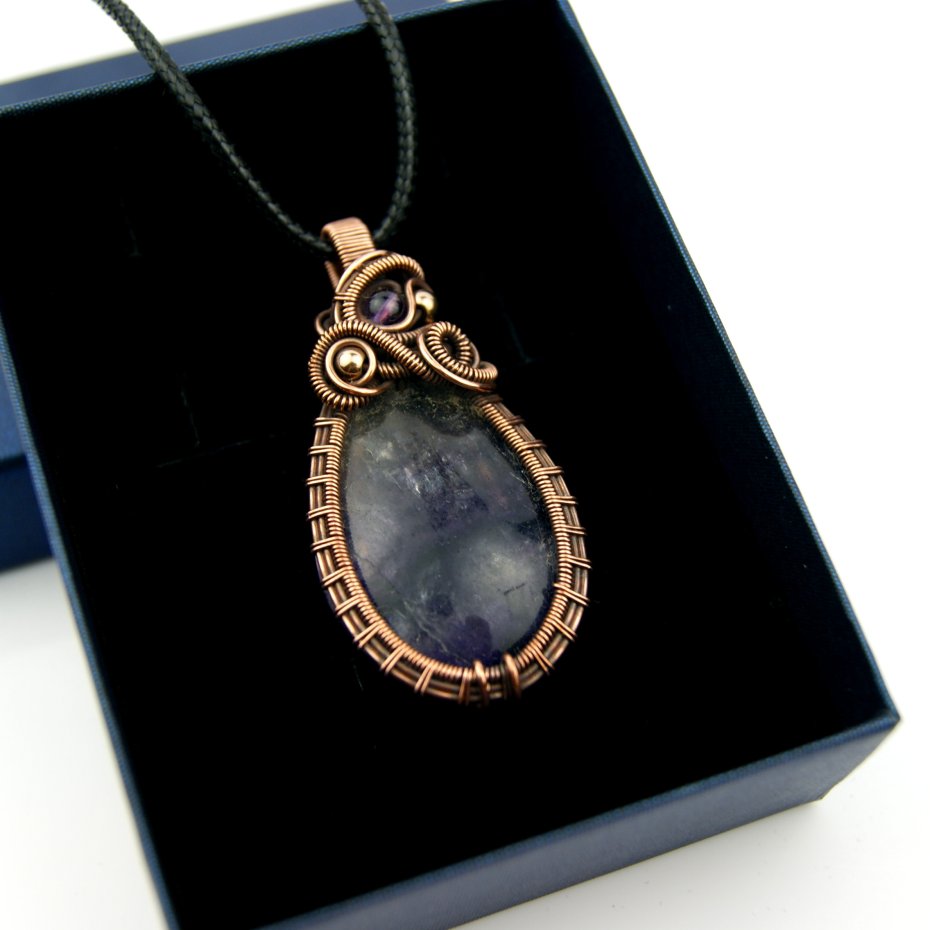 Wisiorek powstał z kamienia fluorytu w kształcie łezki, niewielkiego kamienia ametyst oraz złotych hematytów. Całość misternie opleciona miedzią.