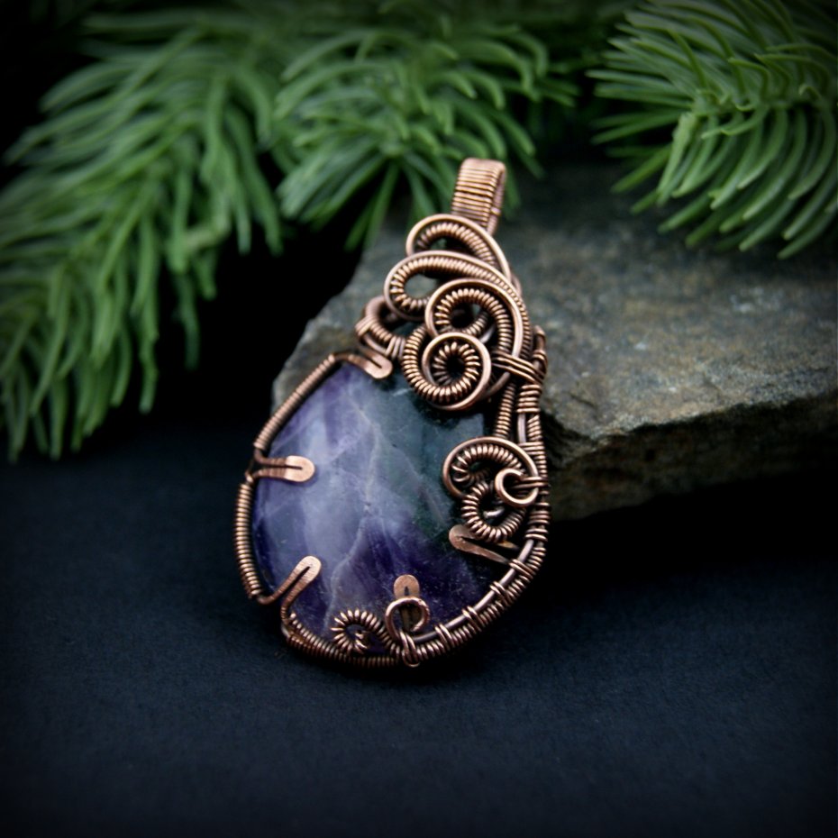 Wisiorek powstał z kamienia fluorytu w kształcie łezki. Kamień ma niejednolity kolor w odcieniach fioletu i zieleni. Całość misternie opleciona miedzią. Biżuteria oksydowana.