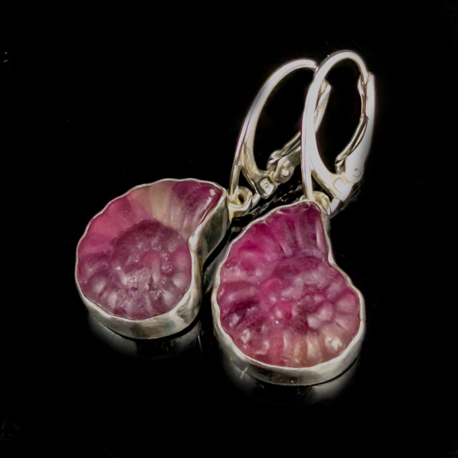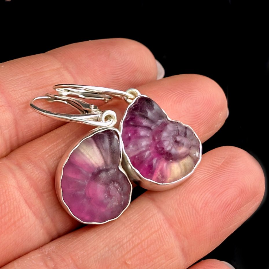 Kolczyki wykonane ze srebra próby 925.z przepięknymi fluorytami w kształcie amonitów. Wymiary oprawy kamienia 17 x 14 mm. Długość max 34 mm. Waga jednego kolczyka 4.53 grama. Zapakowane w ozdobne pudełeczko.