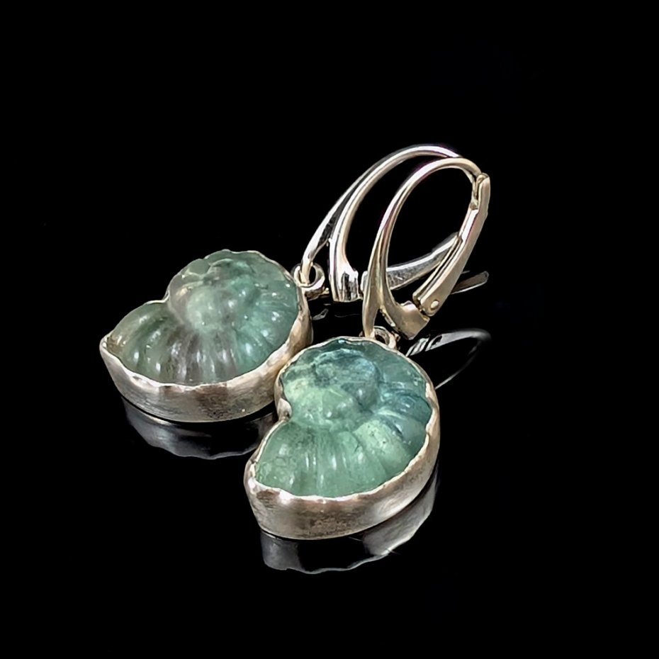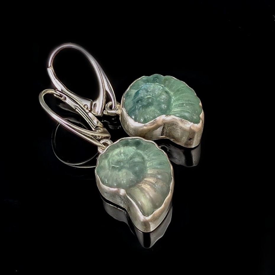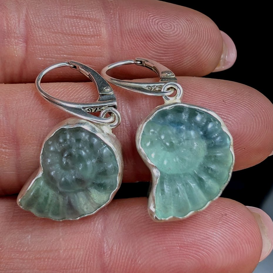 Kolczyki wykonane ze srebra próby 925.z przepięknymi fluorytami w kształcie amonitów.