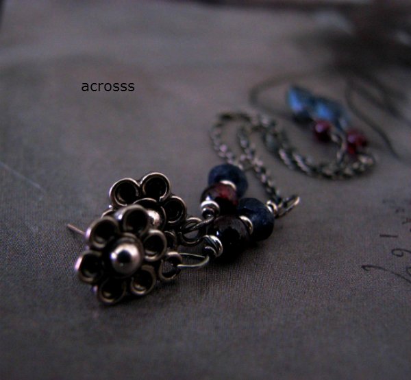 Delikatne, klasyczne, długie kolczyki. Stworzone na bazie mocno oksydowanego, polerowanego srebra pr. 925 oraz 4 mm fasetkowanych oponek sodalitu, kropelek szlachetnego granatu oraz 6 mm kryształków swarovskiego. Bardzo lekkie, na drobnych sztyftach, mierzą ponad 11 cm.