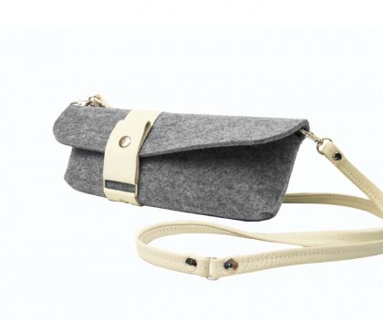 Użyte materiały: szary filc, biało-kremowa skóra, metalowe elementy;