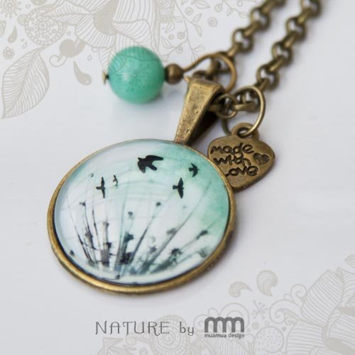 Naszyjnik Flying to bardzo romantyczne, nostalgiczne i kobiece malutkie dzieło sztuki. Obrazek pod szkiełkiem to autorska ilustracja. Naszyjnik świetnie pasuje do kompletu z kolczykami dostepnych w osobnej ofercie :)
