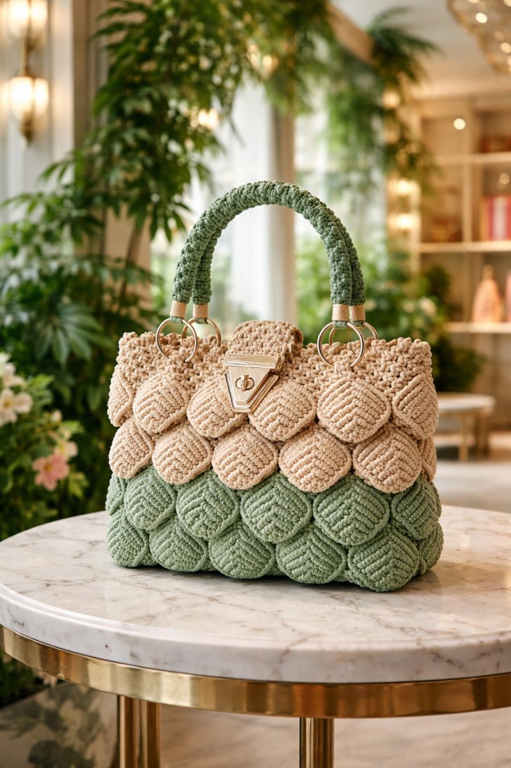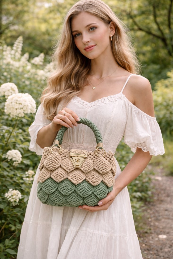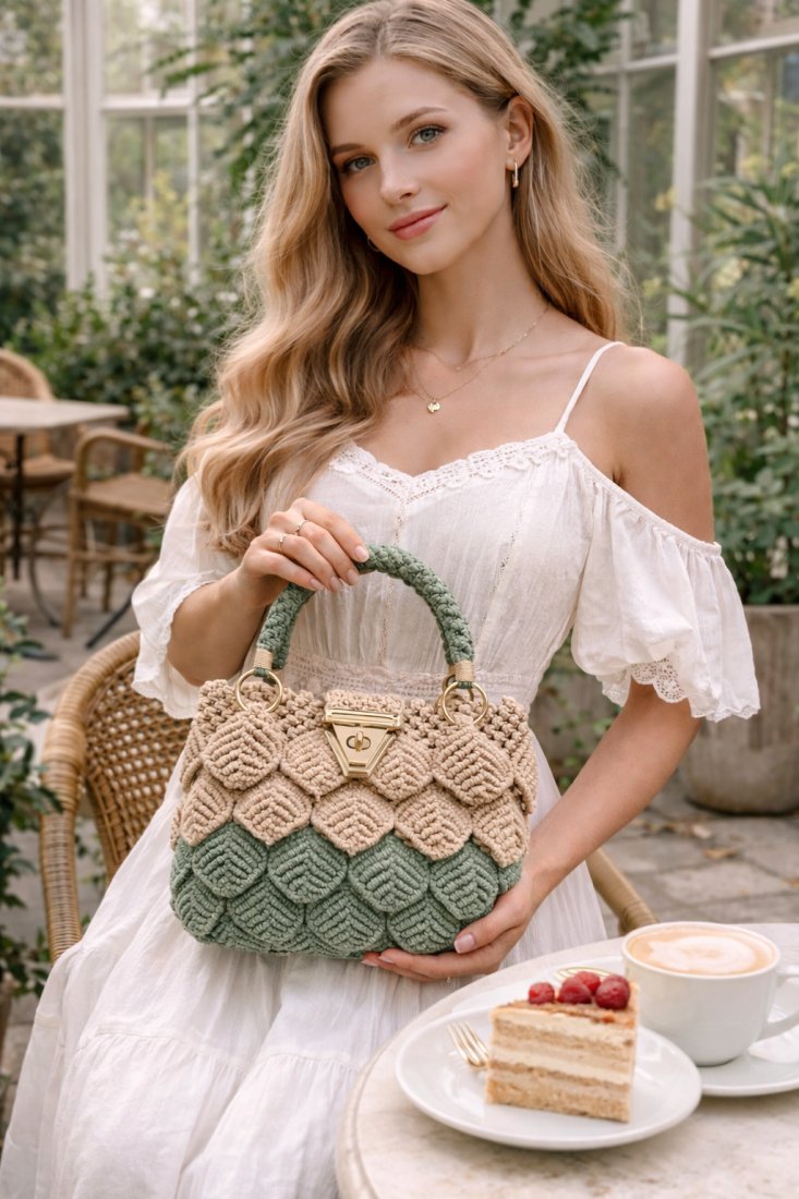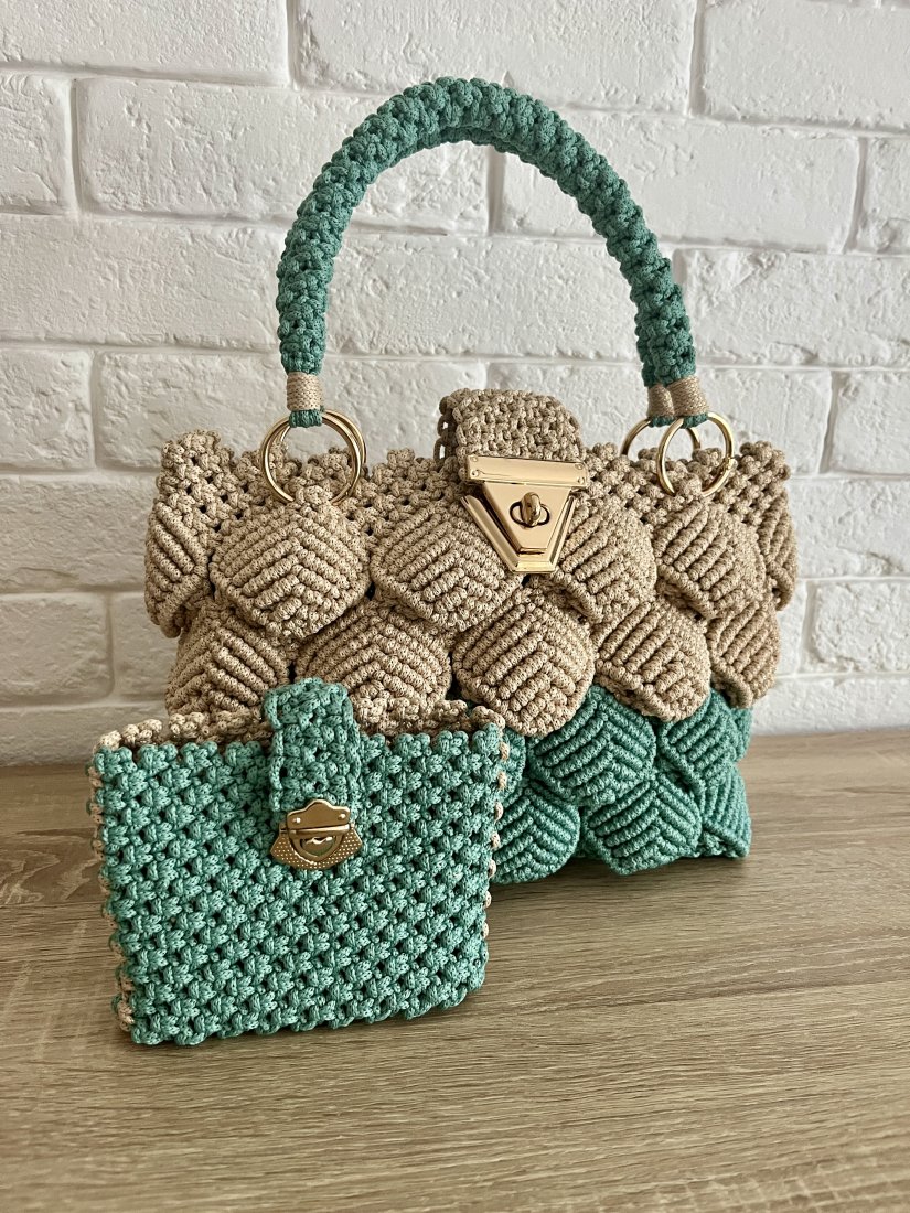 Torebka powstała z inspiracji spokojem natury, jej rytmem , harmonią i subtelną elegancją . Delikatne odcienie beżu i zieleni przeplatają się jak liście poruszane letnim wiatrem. Wykonana z wysokiej jakości sznurka , starannie upleciona splotami makramy . Pasuje do wszystkiego co kochasz ; do porannej kawy w ulubionej restauracji, do spaceru wśród zieleni .