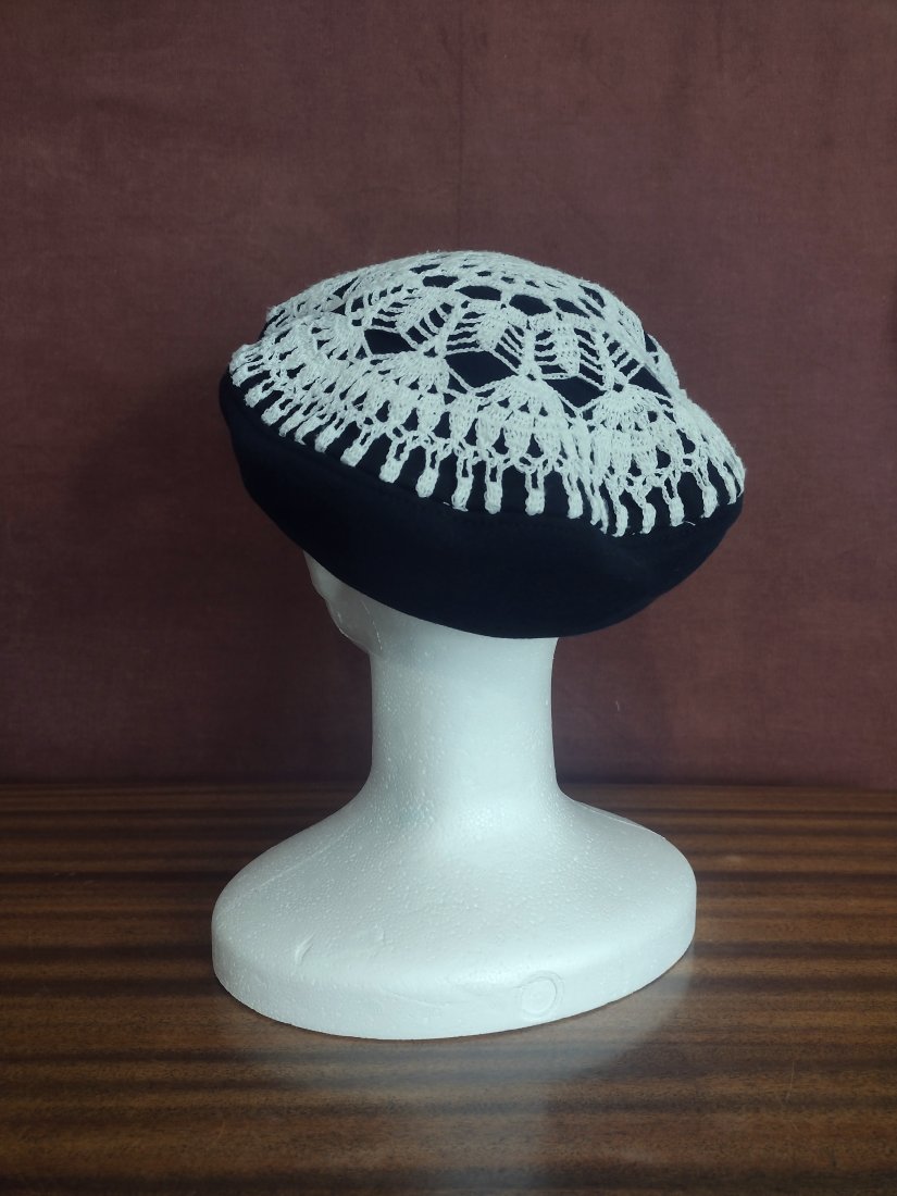 uszyty na podszewce, do noszenia w centralnej osi głowy, jak na zdjęciu, można układać na bok przechylając cały beret