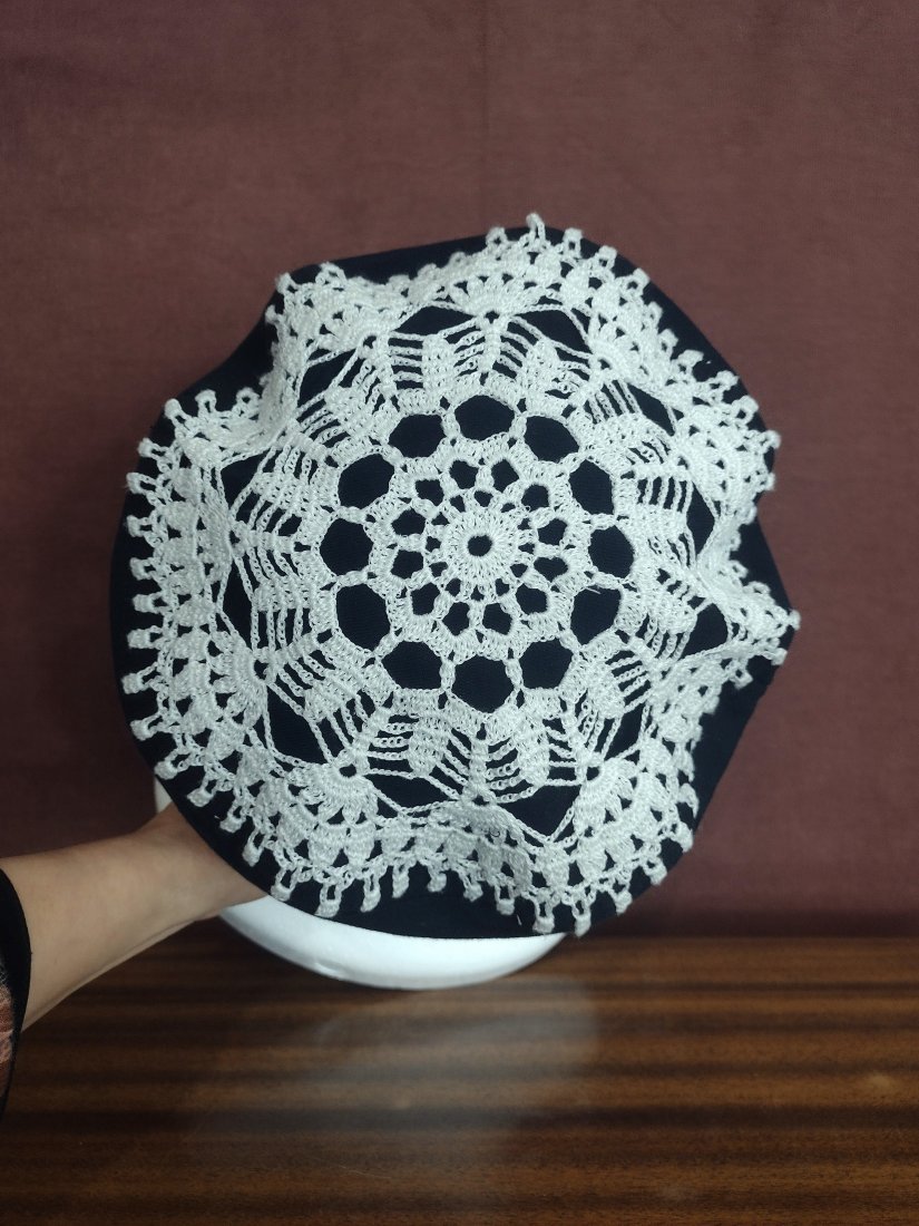 MATERIAŁ - dzianina bawełniana grubsza, typ dresowa , w środku podszewka poliestrowa, biały ażur to oryginalna serweta robiona na szydełku,