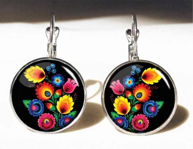 Ręcznie robione kolczyki wiszące z wysokiej jakości grafiką pokrytą wypukłym, powiększającym szkiełkiem.