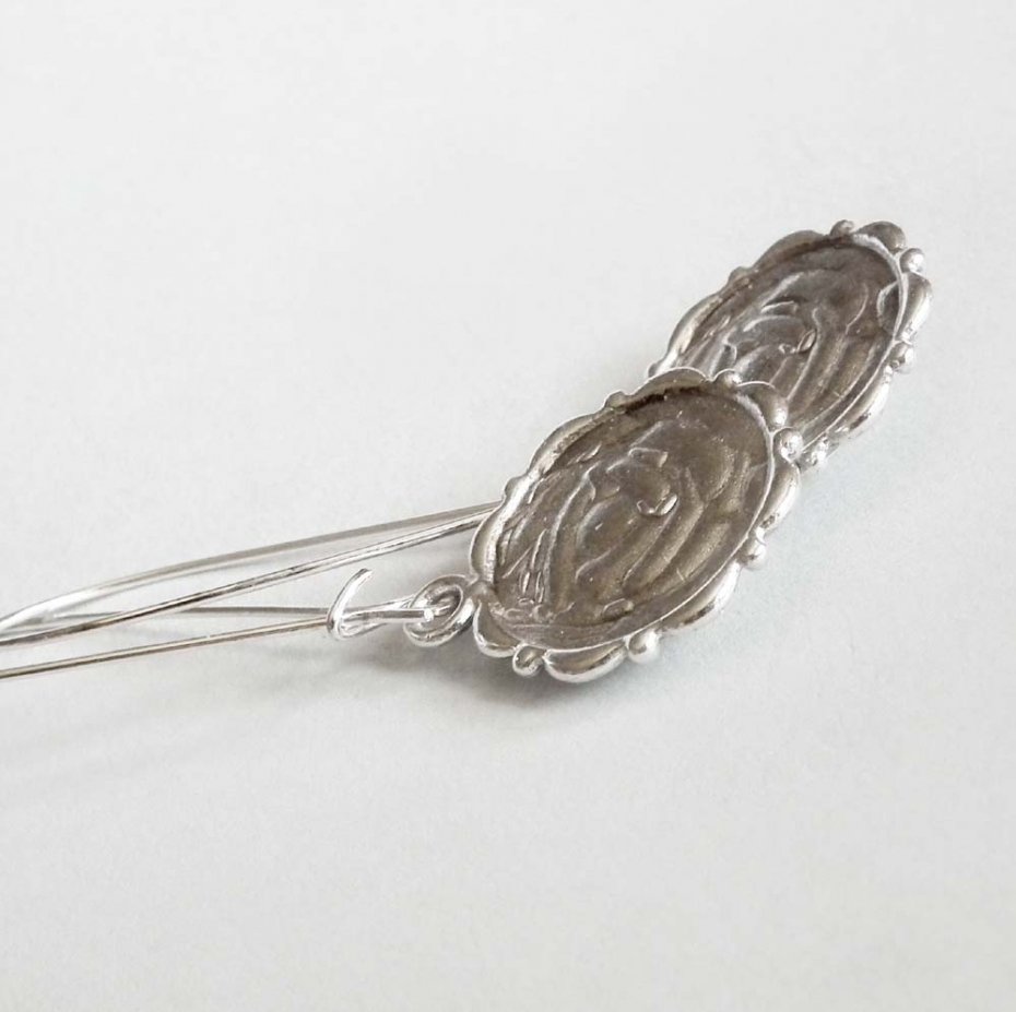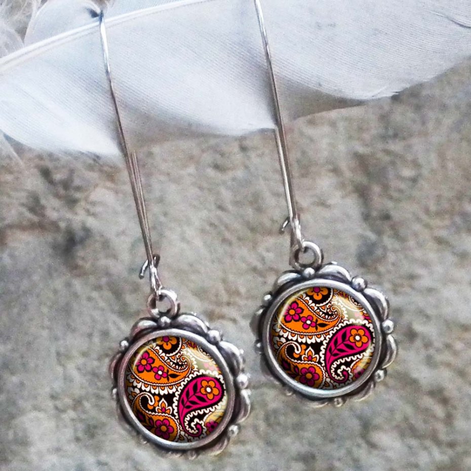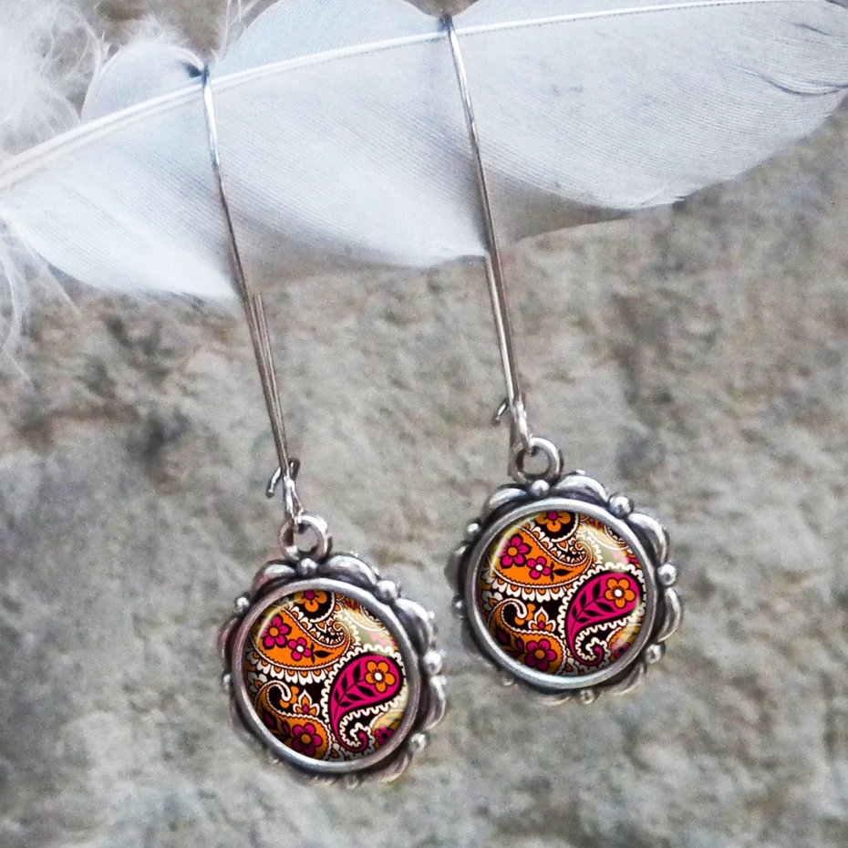 Kolczyki wiszące z oryginalną grafiką, zatopioną pod wypukłym szkiełkiem i oprawioną w bazę w kolorze antycznego,oksydowanego srebra. Grafika jest najwyższej jakości, wyraźna i nasycona. Bigle hipoalergiczne, zapinane posrebrzane. Oryginalne kaboszony- wykonane ręcznie według mojego projektu i przeze mnie, z dbałością o każdy detal. Biżuteria nie zawiera niklu i ołowiu.
