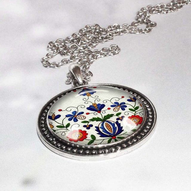 Unikatowy naszyjnik z autorską grafiką. Okrągły wisior w kolorze antycznego srebra, zawieszony na łańcuszku. Łańcuszek posiada zapięcie, można go wyjąć i wisior zawiesić na innym łańcuszku lub rzemieniu. Motyw graficzny umieszczony za wypukłym szkłem - tzw. kaboszonem nadającym efekt 3D. Obrazek jest bardzo wyraźny, w intensywnych kolorach. Wydruk najwyższej jakości na papierze foto. Biżuteria nie zawiera niklu i ołowiu.