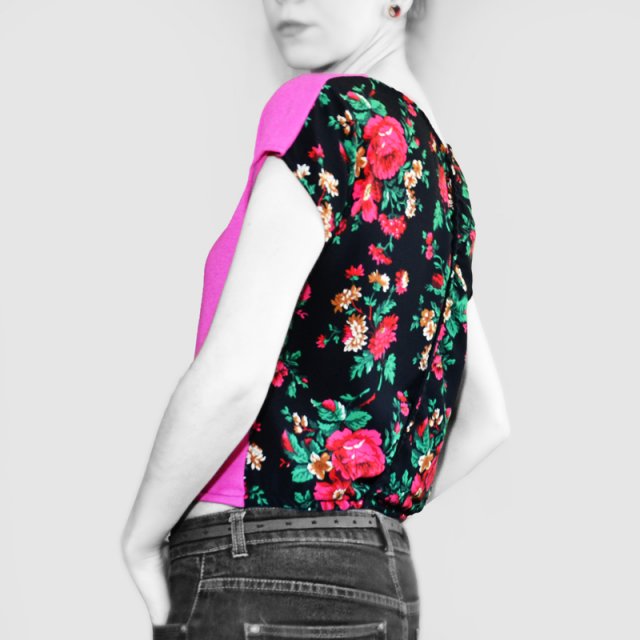 Koszulka wykonana została z różowej dzianiny, plecy z pięknego materiału w kwiaty. Starannie wykończona ściągaczem. Plecy wykonany z dwóch nachodzących na sebie elementów. Prosty, wygodny krój. Rozmiar M