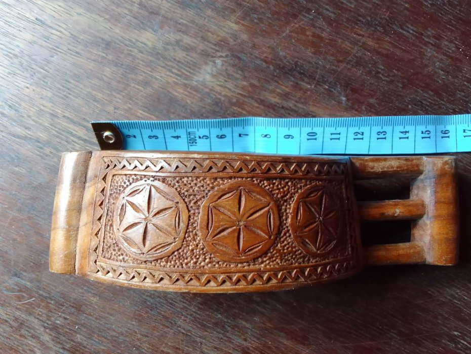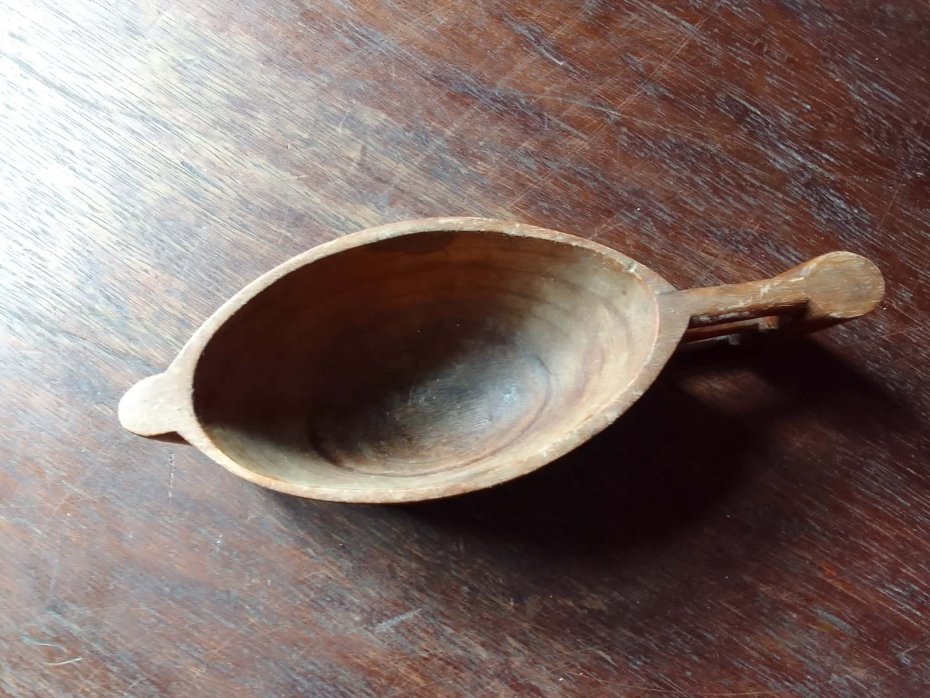 Zdobnictwo: Rękojeść posiada ażurowe rzeźbienia oraz geometryczne nacięcia, co świadczy o ręcznym wykonaniu przez rzemieślnika lub artystę ludowego. Przeciwległy koniec misy zakończony jest dekoracyjnym "noskiem".