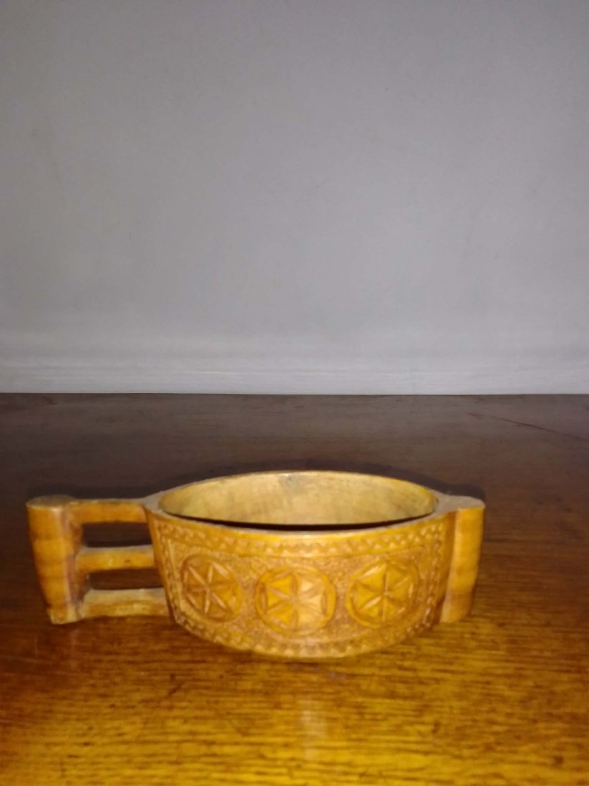 Oryginalne naczynie wykonane metodą snycerską w litym drewnie, nawiązujące formą do tradycyjnych skandynawskich kubków typu kuksa lub pasterskich czerpaczew. Przedmiot o surowym, rustykalnym charakterze, łączący funkcję użytkową z dekoracyjną.