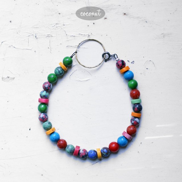bransoletka na stalowej lince, elementy ze srebra i mosiądzu, kamienie: turkus, marmur, koral, howlit.