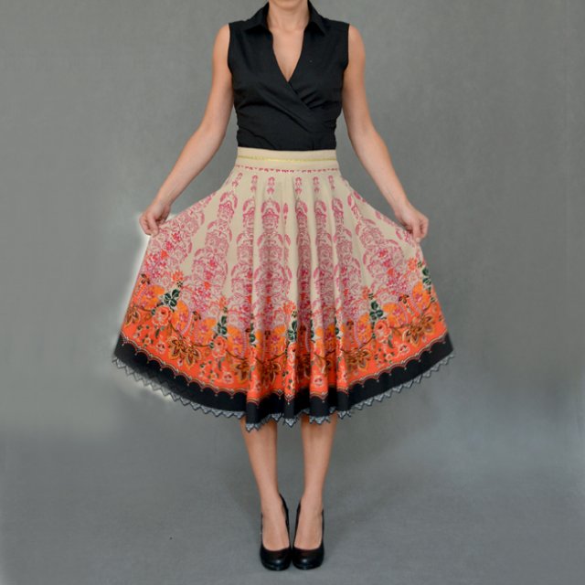 Piękna spódnica w folkowy motyw. Pięknie ubarwiona. Szyta z koła, prawdopodobnie przez osobę prywatnie. Bardzo ładnie wykończona. Zapinana na zameczek i zatrzask. Bez podszewki. Polecam bardzo.